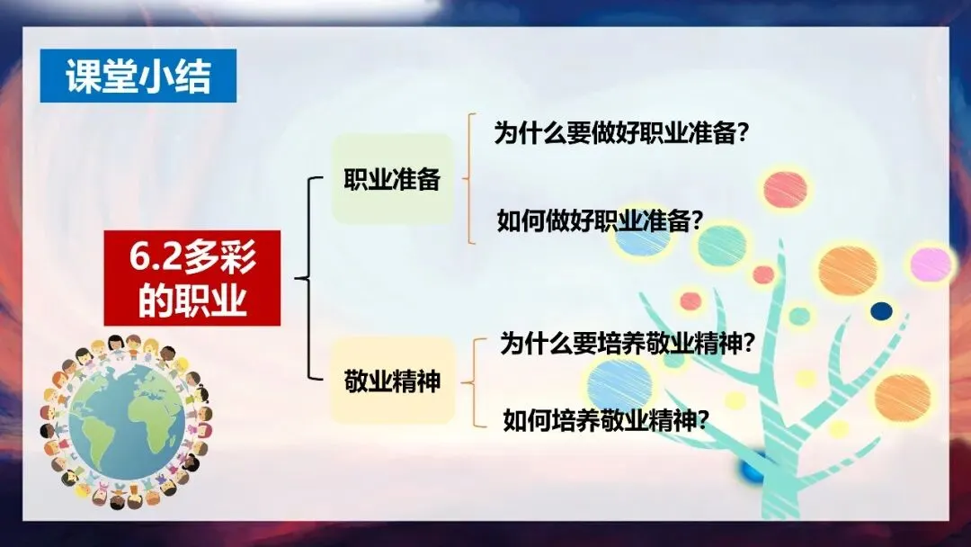 同学们,今天我们一起学习了《多彩的职业》,主要围绕“职业准备”和“敬业精神”两个关键内容展开。我们知道了做好职业准备既是国家发展的需要,也是实现个人人生价值的必经之路,而做好职业准备需要我们兼顾自身因素和社会需求,制定科学的职业生涯规划;我们也理解了敬业精神的重要意义,知道了培养敬业精神要从处理好职业与兴趣的关系、努力提升自身素养做起。