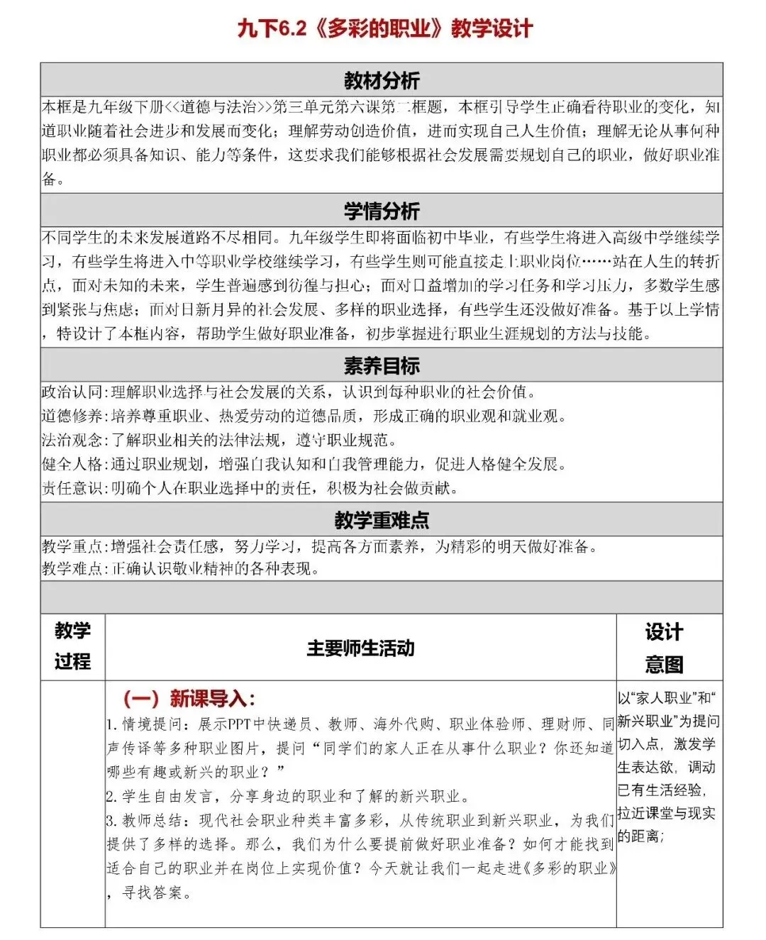 各位同学,大家好!今天我们要一起学习九年级下册道德与法治第三单元第六课的第二框题——《多彩的职业》。在正式进入新课之前,老师想先问问大家:你们的家人正在从事什么职业呀?有没有同学愿意分享一下?(稍作停顿,等待学生发言)哇,同学们提到了教师、医生、工程师、快递员这么多职业,非常棒!那除了这些常见的职业,你们还知道哪些有趣或者新兴的职业呢?(再次停顿,引导学生思考发言)没错,像直播带货主播、AI训练师、旅行定制师这些都是近年来兴起的新职业。
