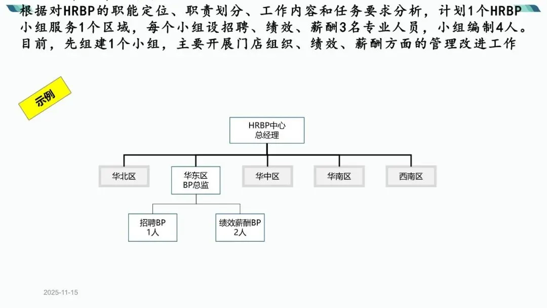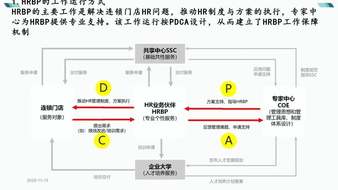 落地执行:承接COE输出的方案与政策,结合业务部门实际,制定定制化落地计划,推动政策落地(如绩效评估、员工培训、人才培育等);