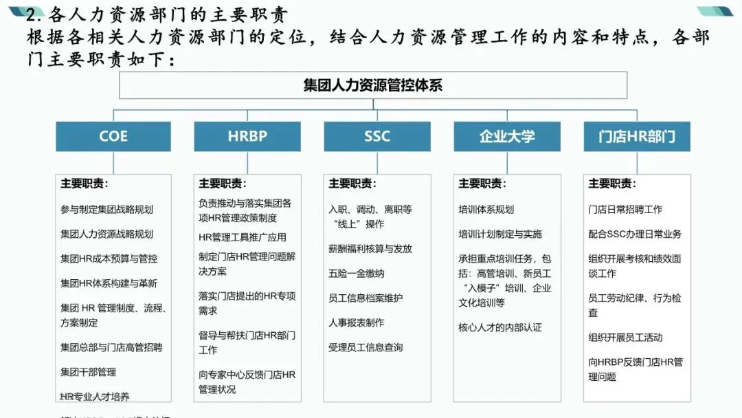 备注:中小型企业可根据人力成本预算,合并部分岗位(如COE专家可兼任多个模块专业工作,HRBP可兼顾多个小型业务部门),确保体系落地可行性;大型企业可细化各支柱岗位,提升专业化水平。