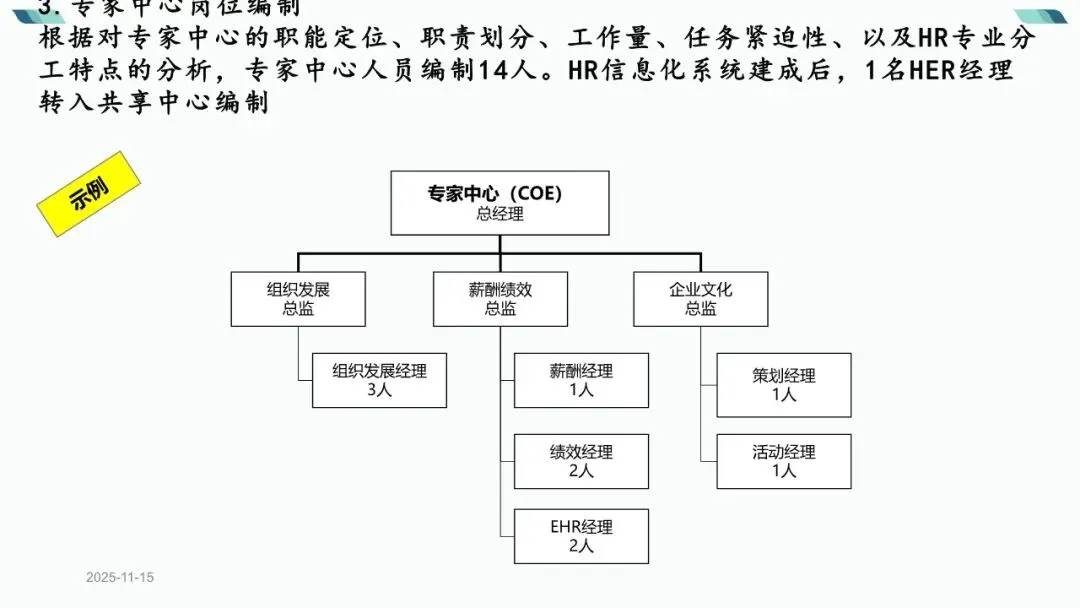 专家中心(COE):隶属于人力资源部,由COE负责人牵头,根据企业需求设置薪酬绩效专家、招聘配置专家、培训培育专家、员工关系专家等岗位,直接向人力资源总监汇报。