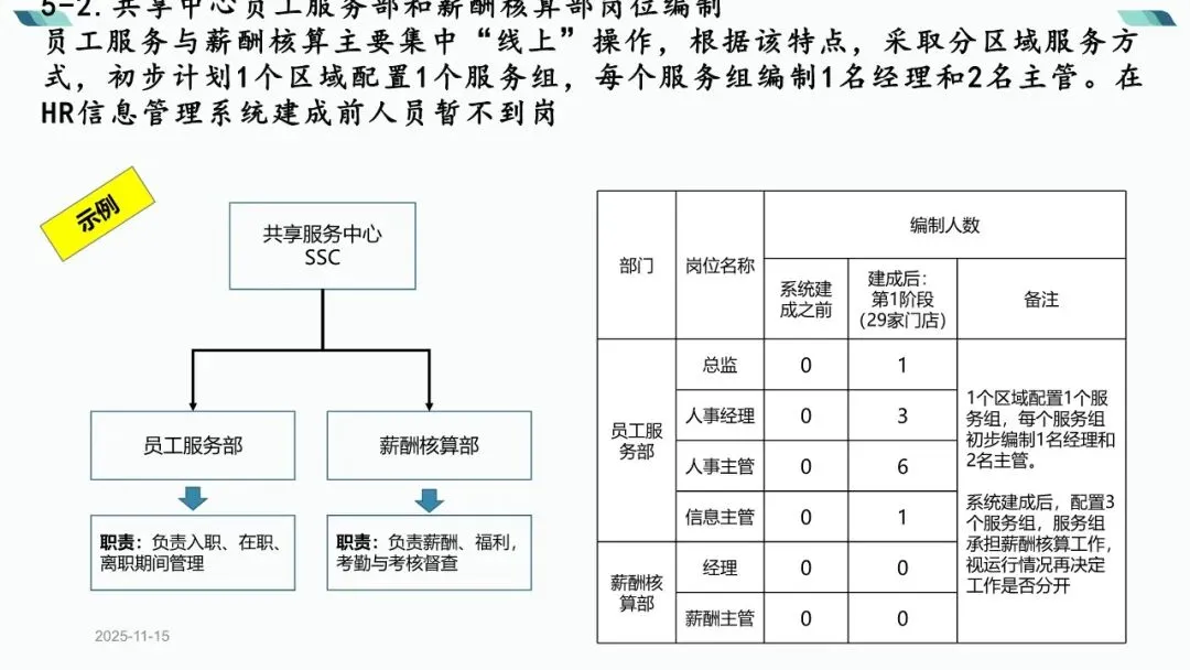 共享服务中心(SSC):隶属于人力资源部,由SSC负责人牵头,根据事务性工作规模,设置薪酬核算专员、社保公积金专员、入离职专员、考勤专员、咨询专员等岗位,直接向人力资源总监汇报。