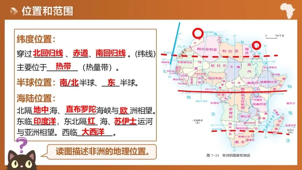 1. 能准确描述非洲的地理位置,并说明其对自然环境的影响。
