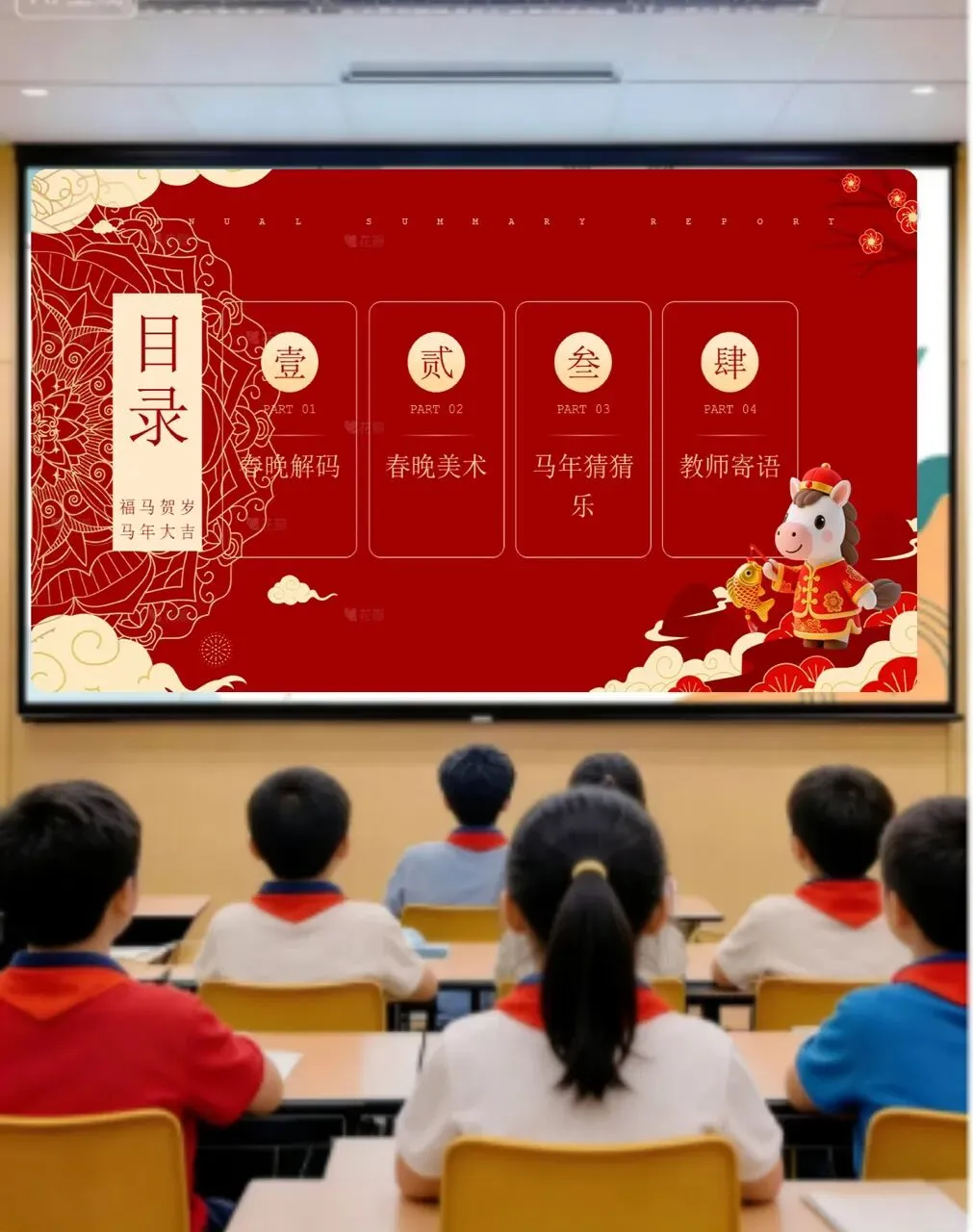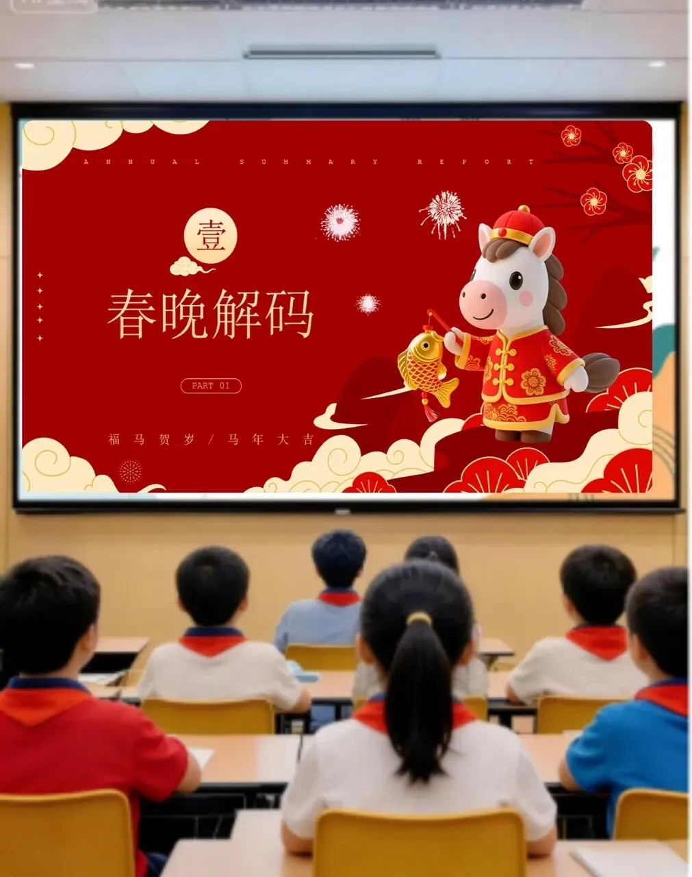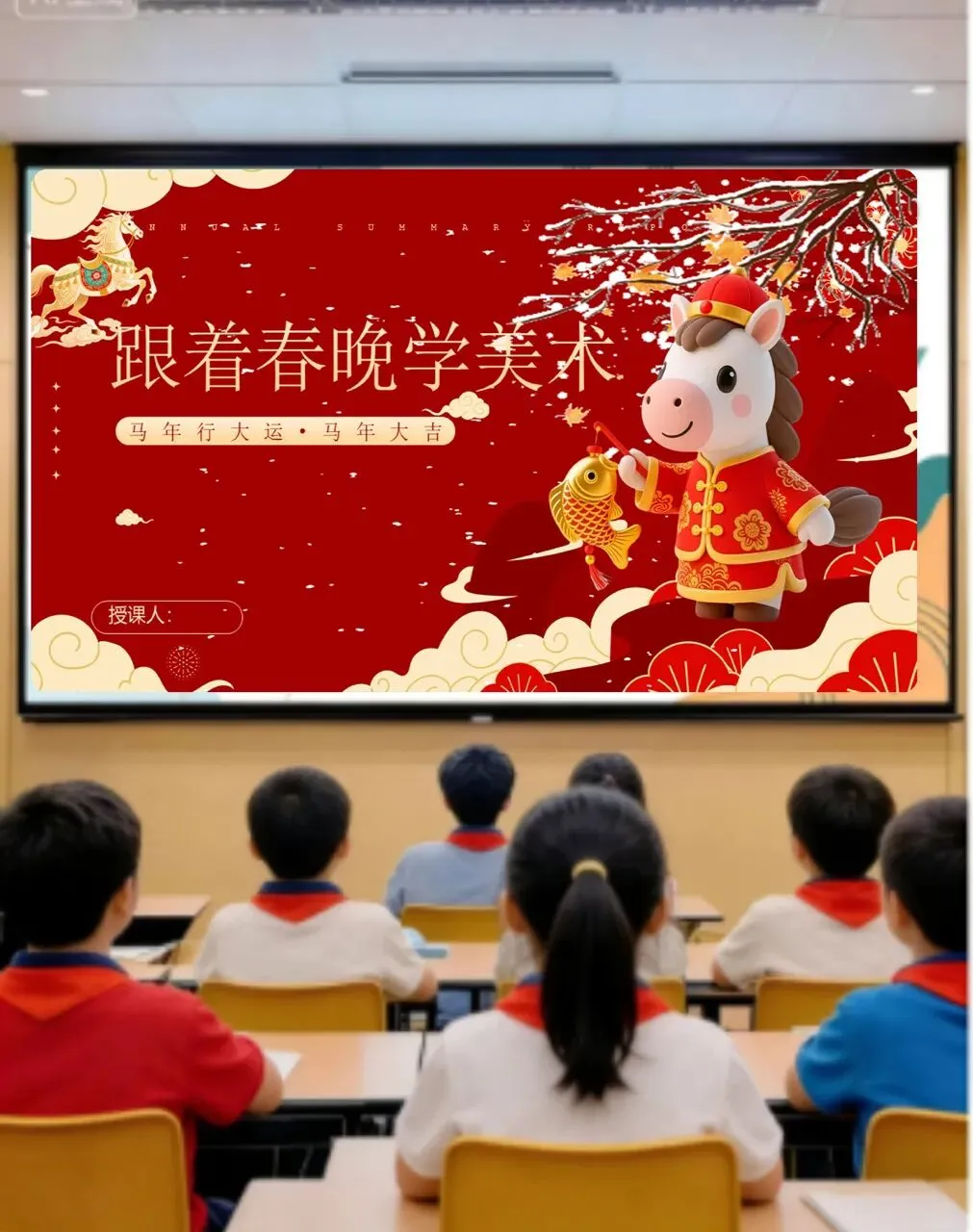不是简单的图片堆砌,而是把春晚顶级审美拆解成50页可落地的美术课堂!传统纹样详解、舞台配色分析、动态构图拆解……每3页就有一个互动提问点,每5页设置一个课堂小练笔。教研组听课?家长开放日?这份课件让你从容hold住全场,上出有深度、有审美的开学第一课!【获取方式】1、点击关注2、后台发消息:213