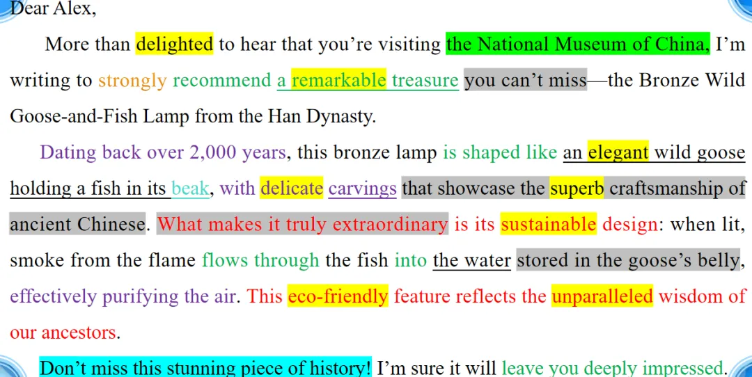 - 词汇:文物类词汇(bronze, dynasty, delicate, resourceful,purify, function 等);推荐类表达(recommend, must-see, don't miss 等)