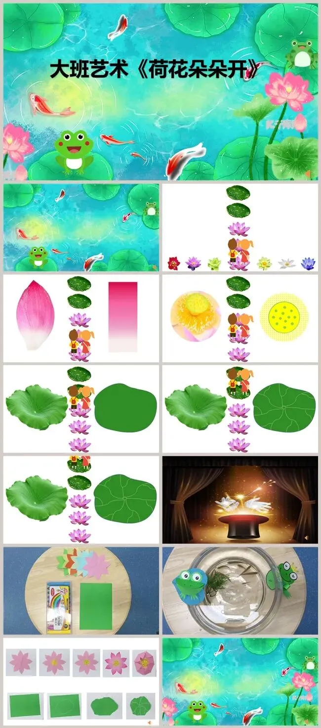 你们的魔术都很成功,给自己一个响亮的掌声。现在池塘里已经是荷花朵朵开了,我们一起喊小兔子,快来看荷花吧。