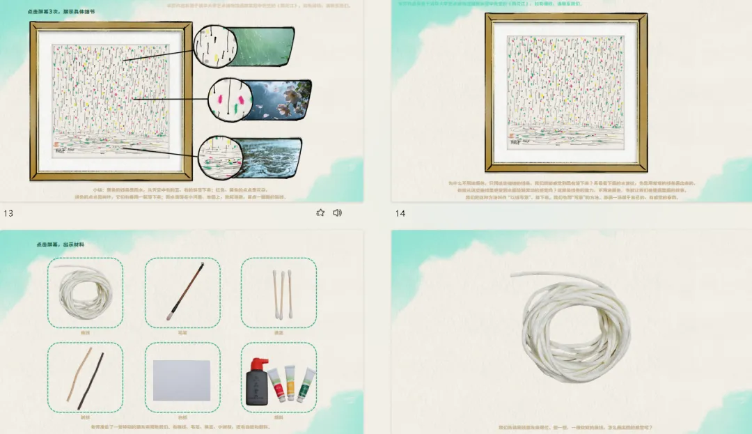 l感知春雨的多样性,初步理解吴冠中画作中点、线的构成之美与色彩交错的意境美。