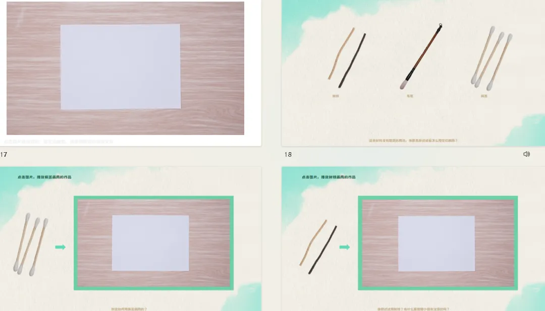 l材料准备:墨水、彩色颜料、颜料盘、棉线、树枝、棉签、毛笔、白纸(以上材料一桌一份)。