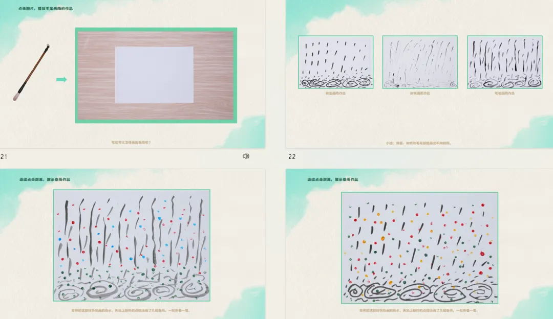 ——我们用小手试着画一画雨从空中落下的样子、雨滴落在地面上的形态,以及雨打在叶子上。