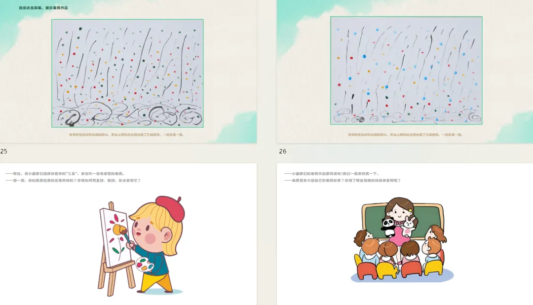 l难点:能够根据自己对春雨的感受,运用直线、弧线、彩点等不同元素,表现出春雨多样的形态和氛围。