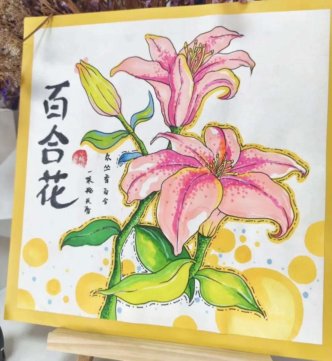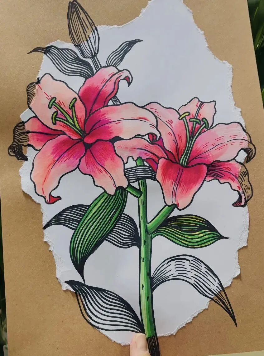2. 勾线定型:用粗勾线笔勾勒百合花的轮廓(花朵、花茎、叶片边缘),强调“线条要流畅,不要反复描”,勾完后用橡皮擦掉铅笔印。