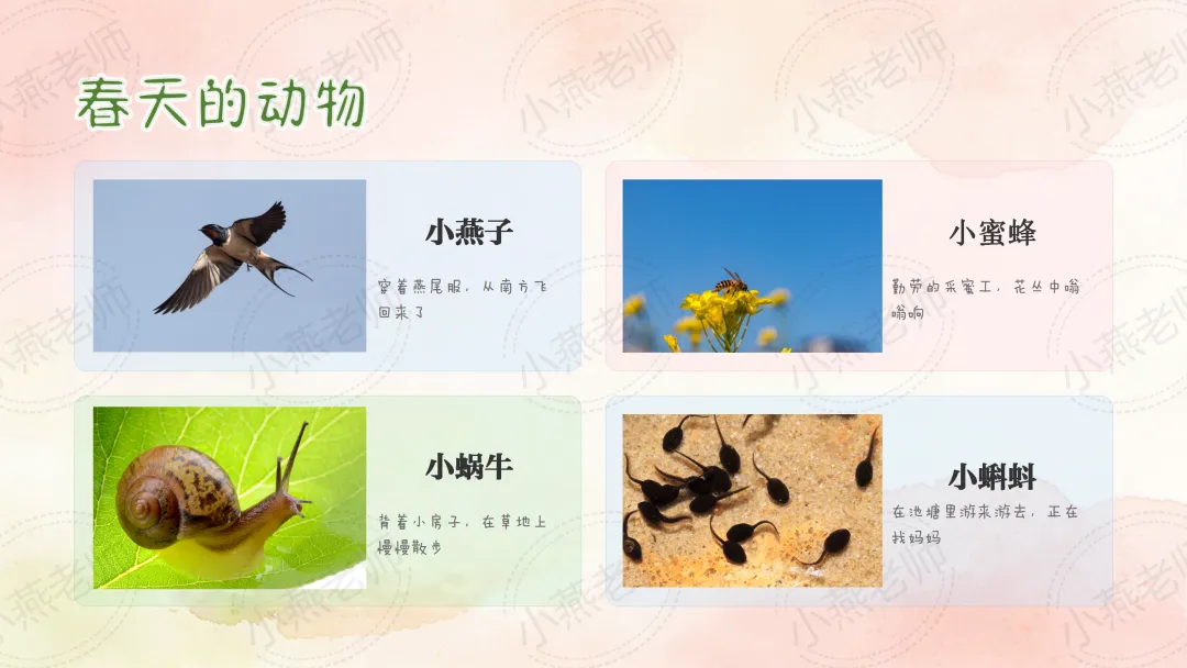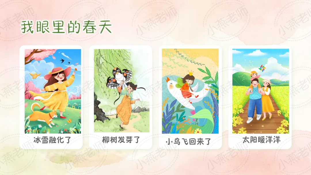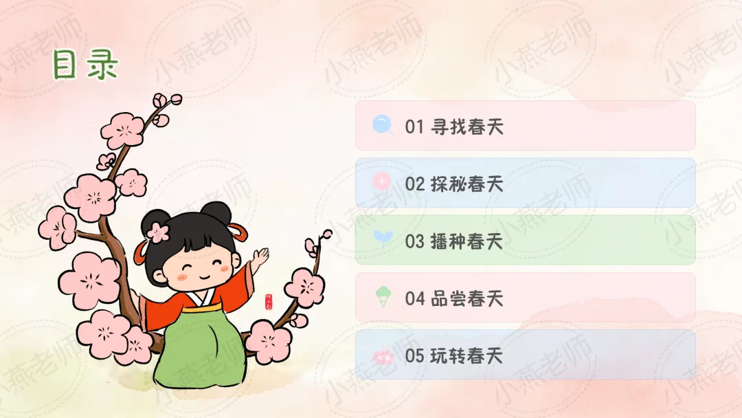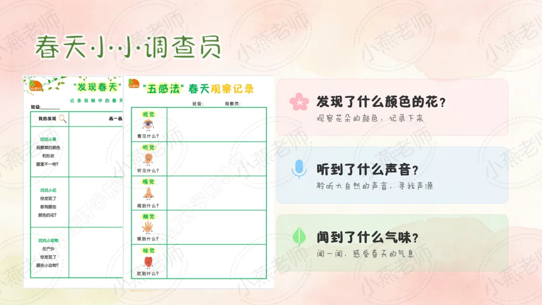 幼儿天生就具有和大自然亲近的本能,我们鼓励幼儿去探索春天,通过一系列丰富多彩的活动,也让孩子们走进春天的怀抱,去观察、去发现、去了解春天的特征,在看、摸、听等各种感官中体验春天给自己带来的喜悦,从而萌发孩子热爱春天、热爱大自然的美好情感。春天,就这样悄悄的来到了孩子们的身边,等待着孩子们去发现它,基于孩子们的兴趣,于是生成了春天的主题课程。小燕整理了小中大班春天班本主题活动教案及课件,包含五大领域。让我们一起用眼睛、鼻子、嘴巴、耳朵去感受春天的气息吧!