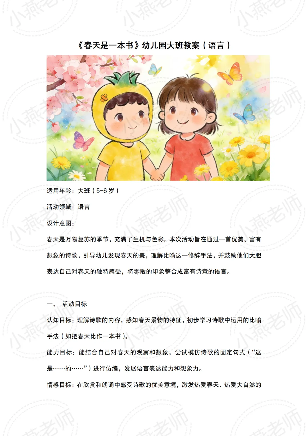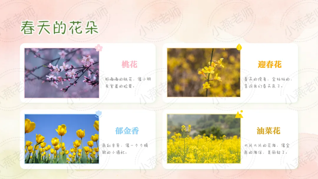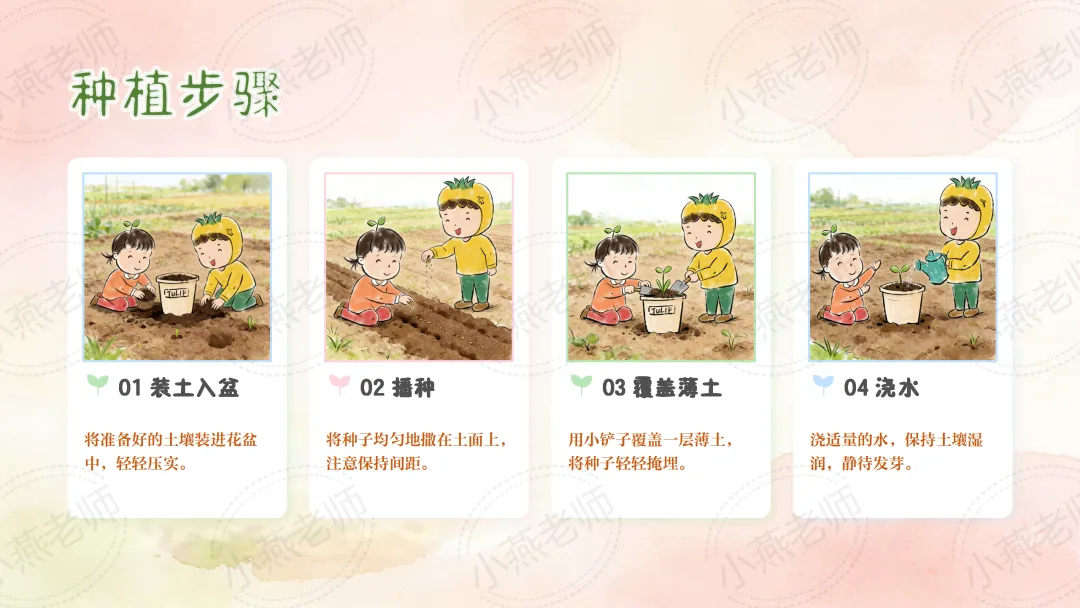 - 情感目标:萌发爱护花草、爱护大自然的情感,感受花朵带来的美好。
