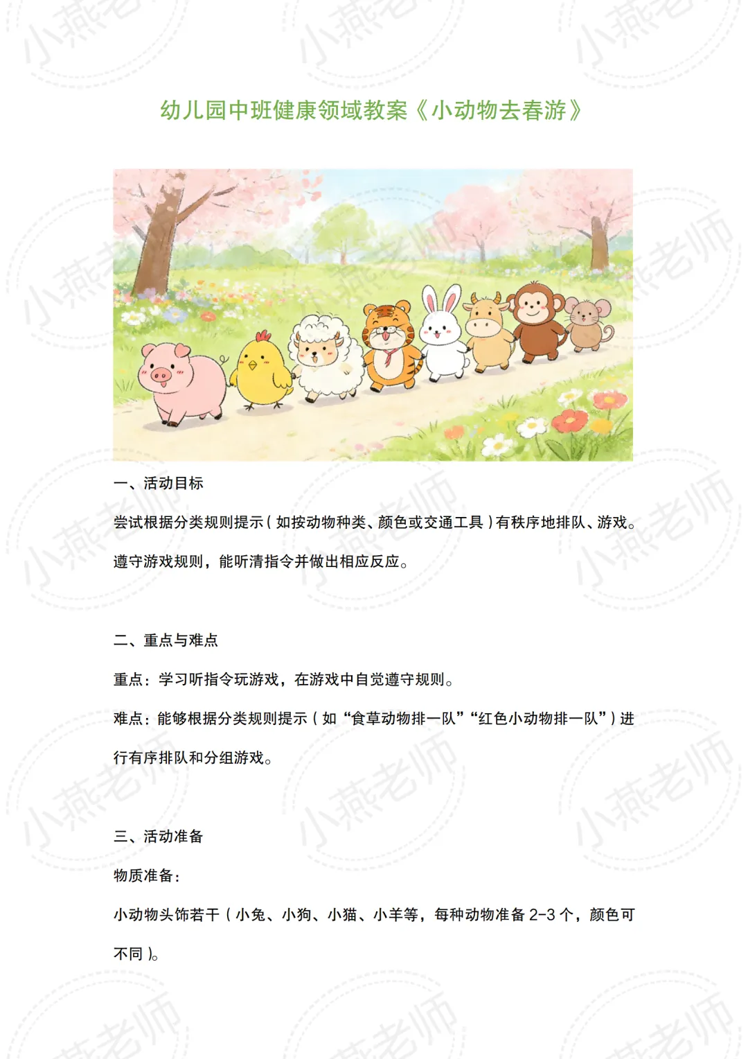 春天是万物复苏的季节,充满了生机与色彩。本次活动旨在通过一首优美、富有想象的诗歌,引导幼儿发现春天的美,理解比喻这一修辞手法,并鼓励他们大胆表达自己对春天的独特感受,将零散的印象整合成富有诗意的语言。- 尝试根据分类规则提示(如按动物种类、颜色或交通工具)有秩序地排队、游戏。