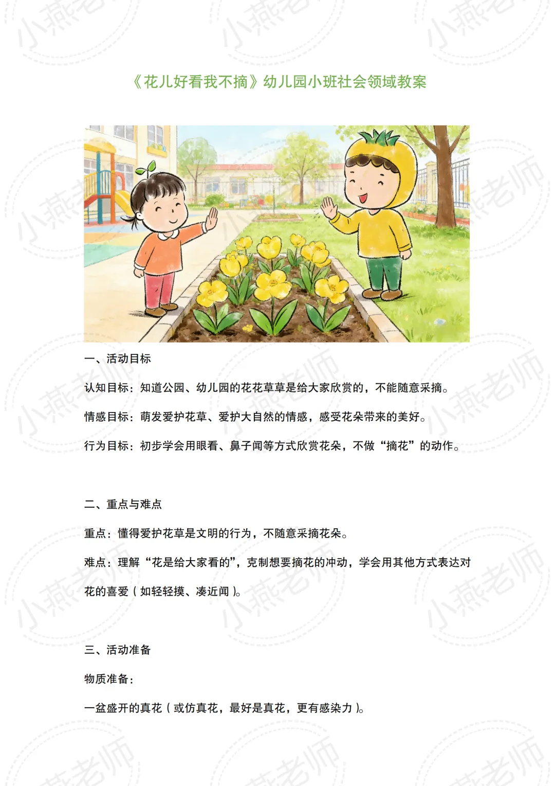 - 认知目标:知道公园、幼儿园的花花草草是给大家欣赏的,不能随意采摘。
