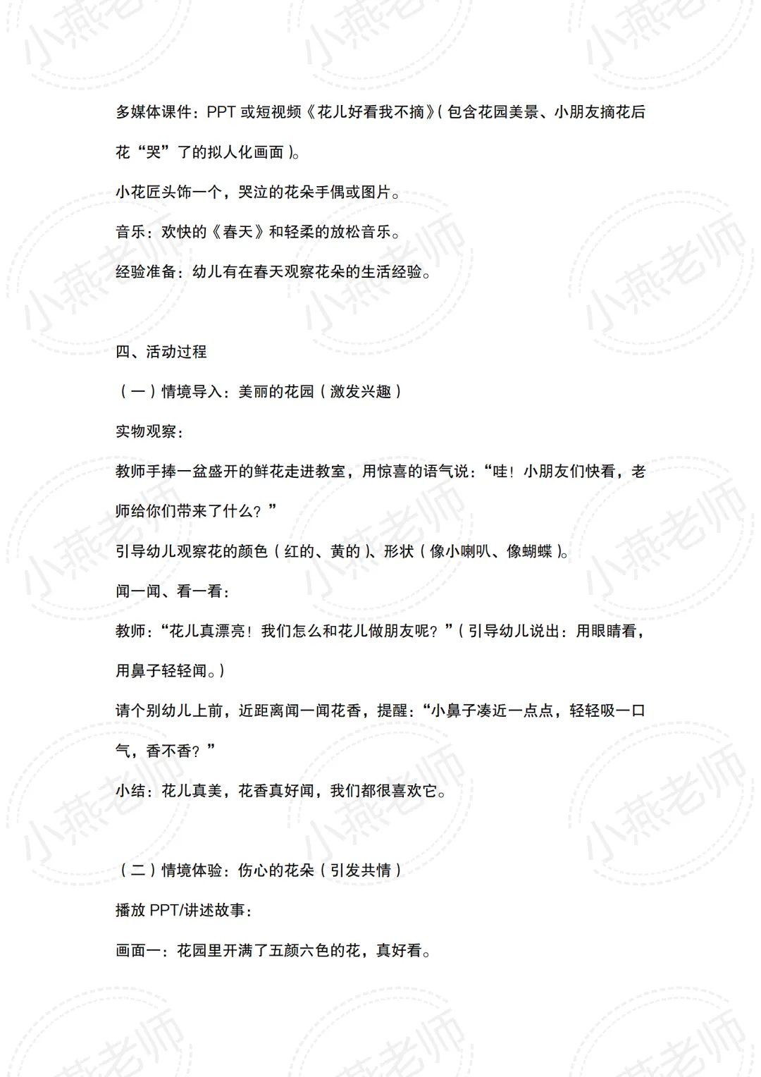 - 行为目标:初步学会用眼看、鼻子闻等方式欣赏花朵,不做“摘花”的动作。