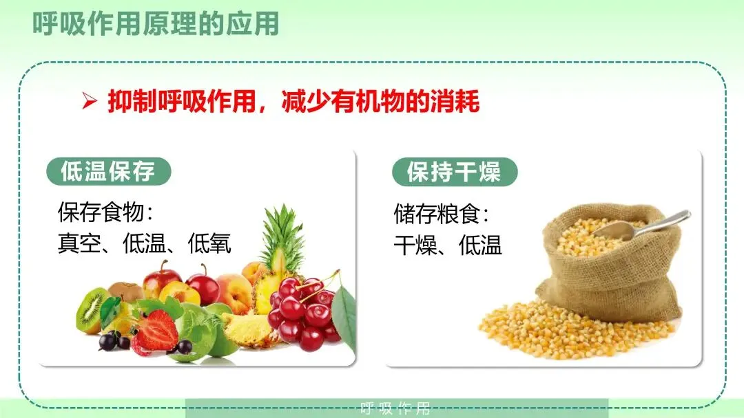 在抑制呼吸方面,结合低温保存水果蔬菜、储粮保持干燥和低温、通入氮气或二氧化碳等案例,引导学生理解降低温度、减少氧气和降低含水量都能抑制呼吸作用,减少有机物消耗。
