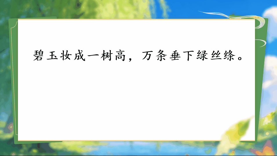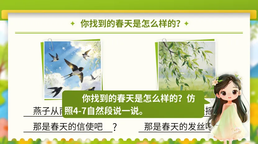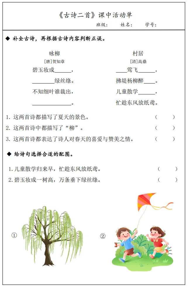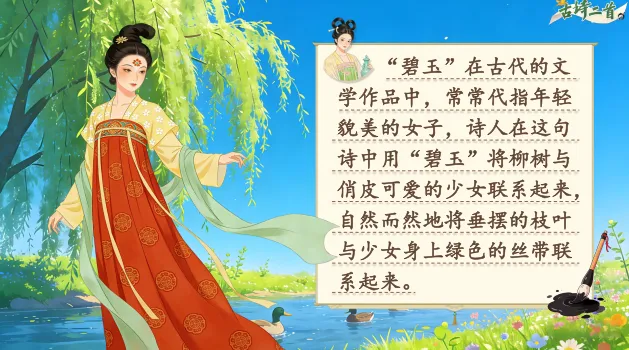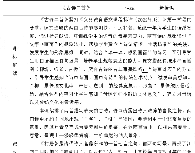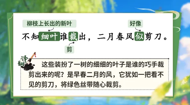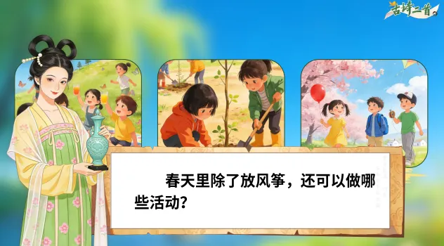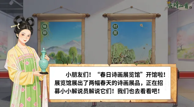 1.1《古诗二首》安排了两首描写春天的古诗,据此设计情境“春日诗画展览馆”,学生化身小小解说员,解说诗画展品——《咏柳》《村居》。
