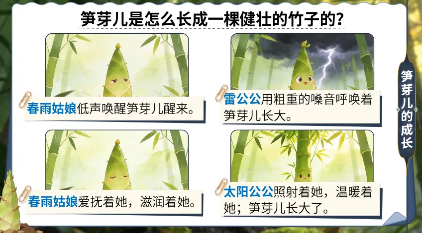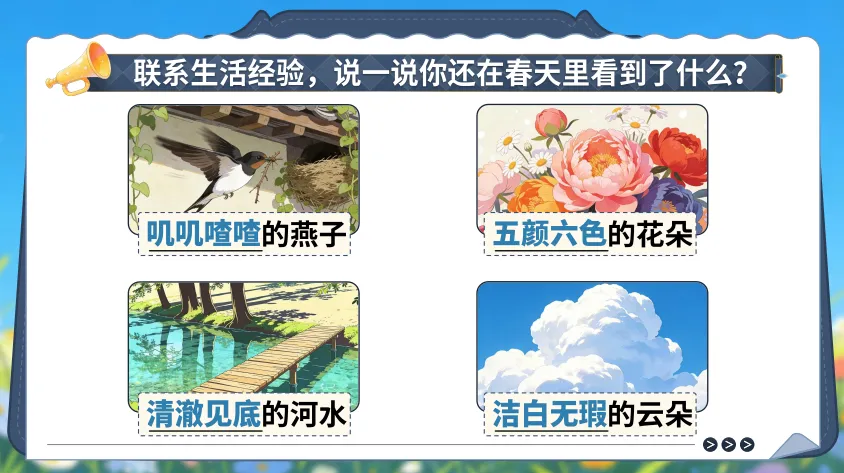 课件注重互动设计,设计丰富的课堂活动,引导学生主动思考、深度参与,调动眼、口、手、脑协同运作,将课堂中的语文与真实生活相连,让学生结合真实的生活体验深化对语文知识的理解,实现教与学的有机融合。