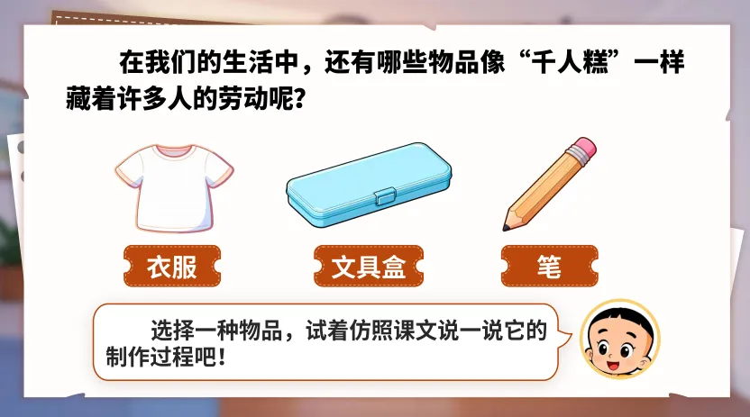 2.2《千人糕》学生化身美食探索小队的队员,跟随大头儿子和小头爸爸一起去发现千人糕的秘密。