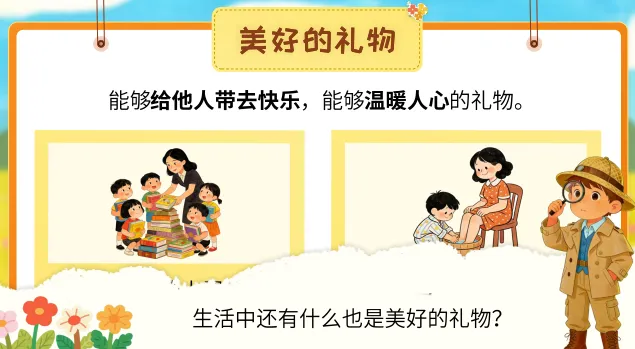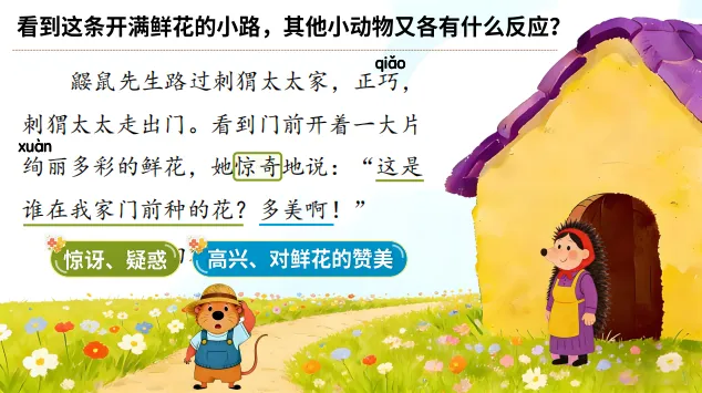 1.3《开满鲜花的小路》以课文中鼹鼠先生这一角色发起求助,请“小侦探们“(学生)帮助他弄清楚包裹里丢失的东西去了哪里,自然引入对课文的讲解。