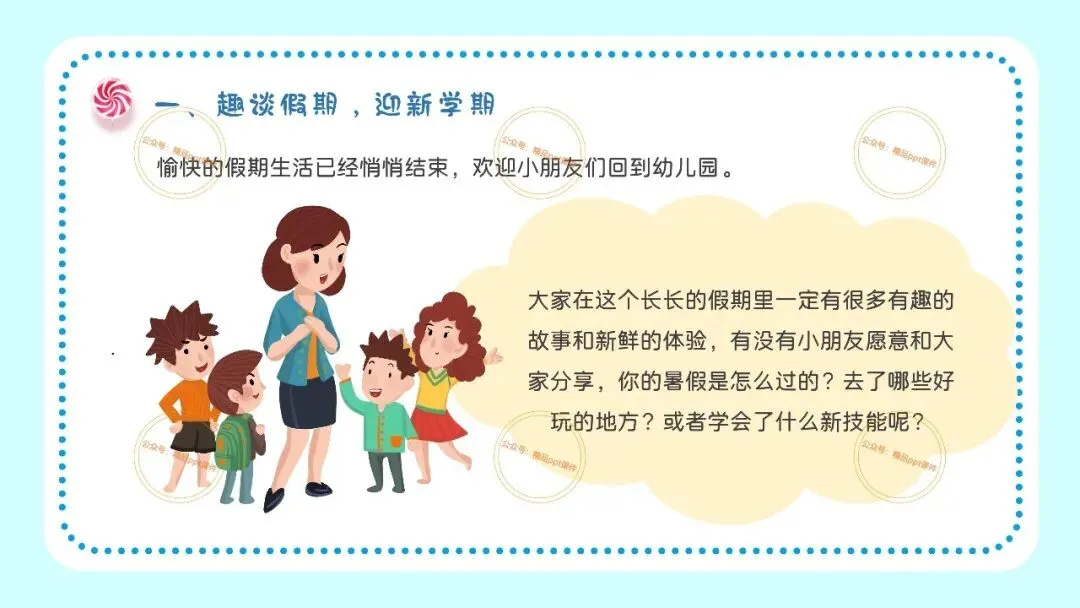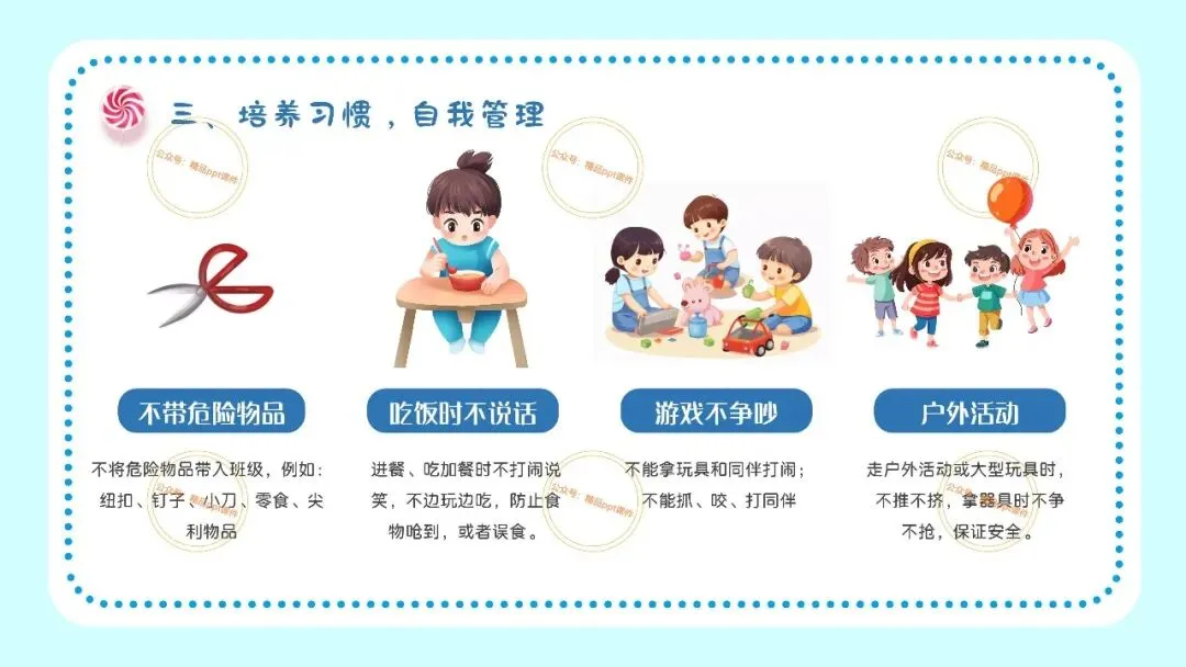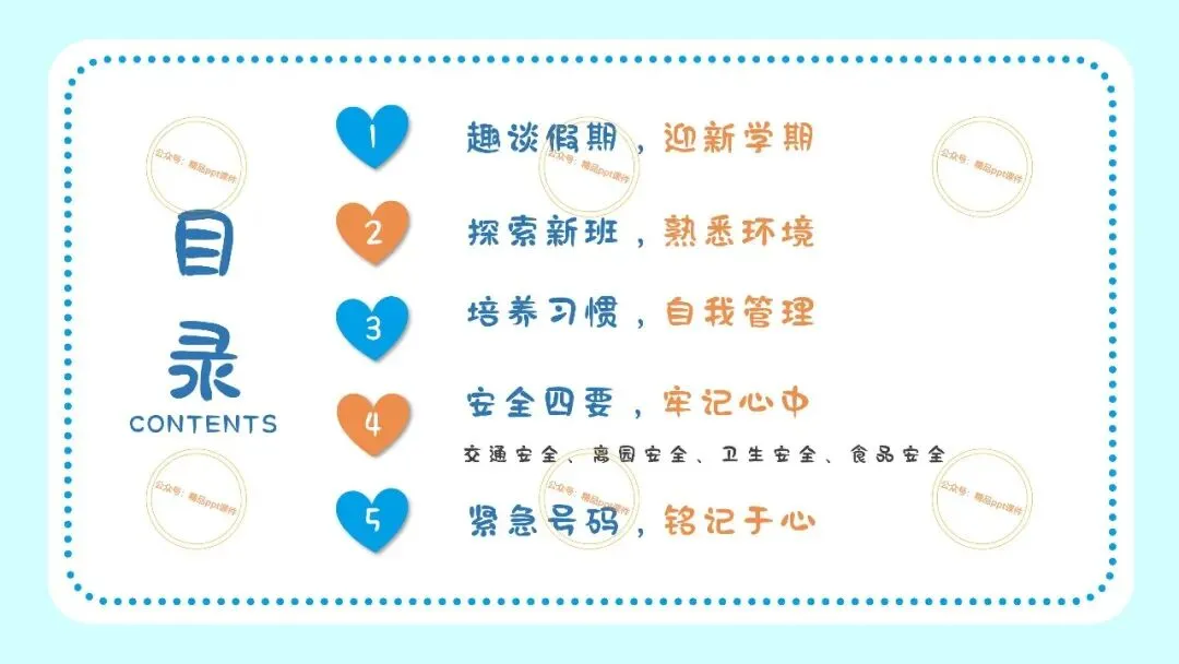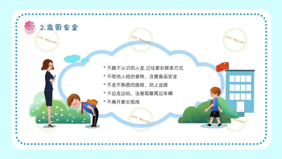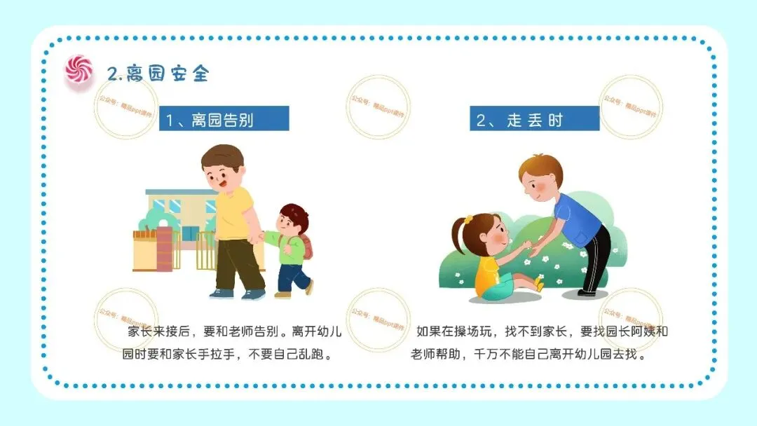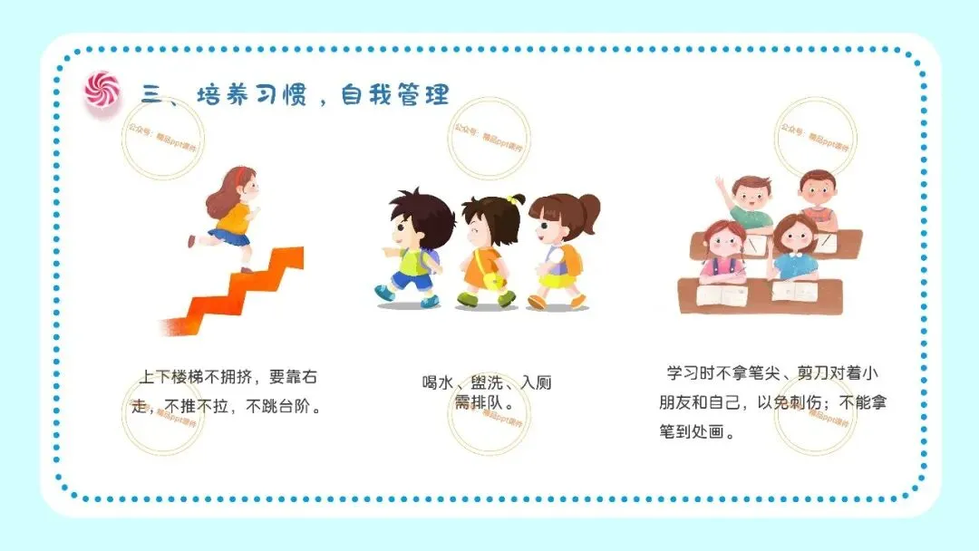 2、本公众号成立的初衷是为广大ppt使用者提升工作效率,所发布的课件资源仅供学习交流禁止用于商业用途,有偿所得用来维系公众号运营所支出的人工成本,性质为买家友情赞助后获取的信息差而非售卖资源的费用。同意此声明后即可下载本期幼儿园开学安全教育培训第一课ppt。如有侵犯您的权利,请联系小沐老师。