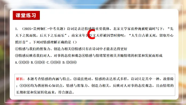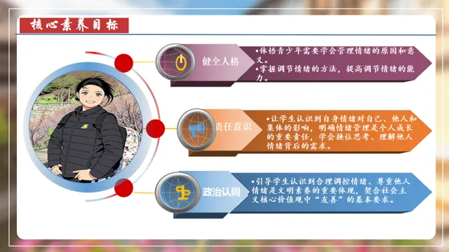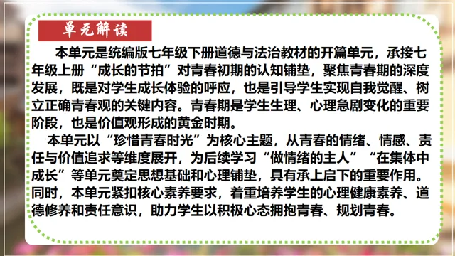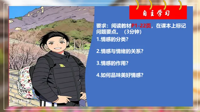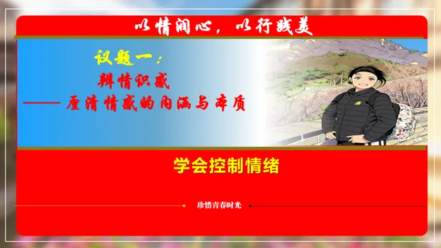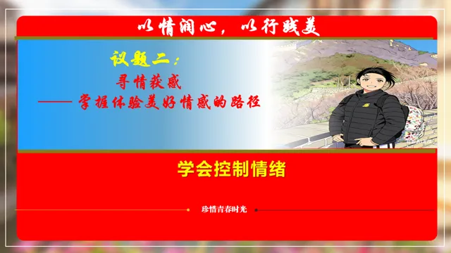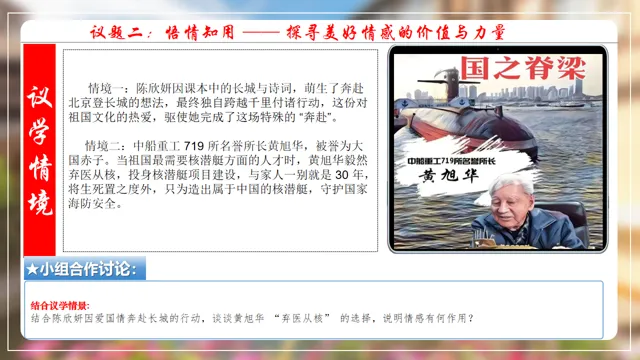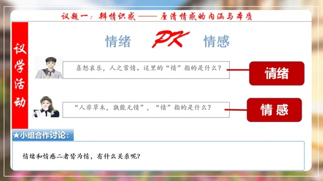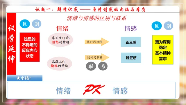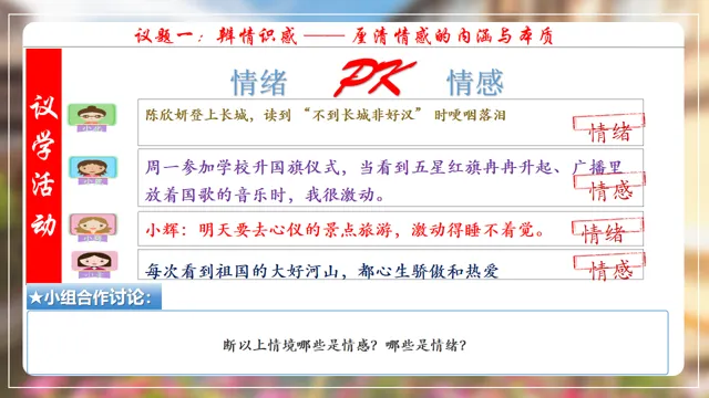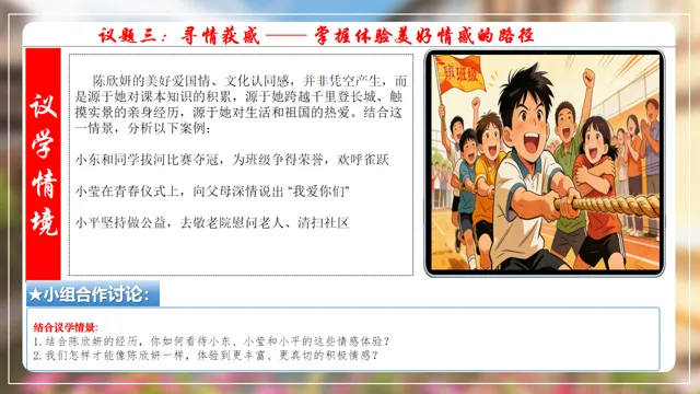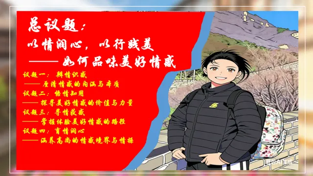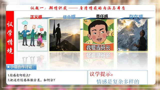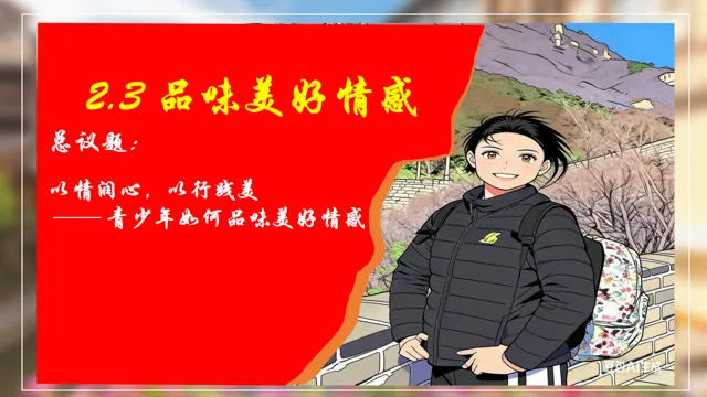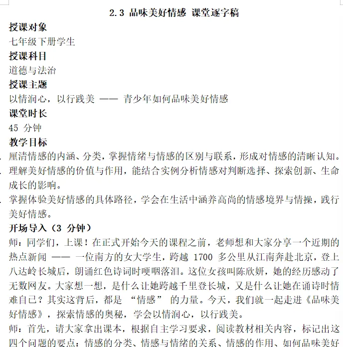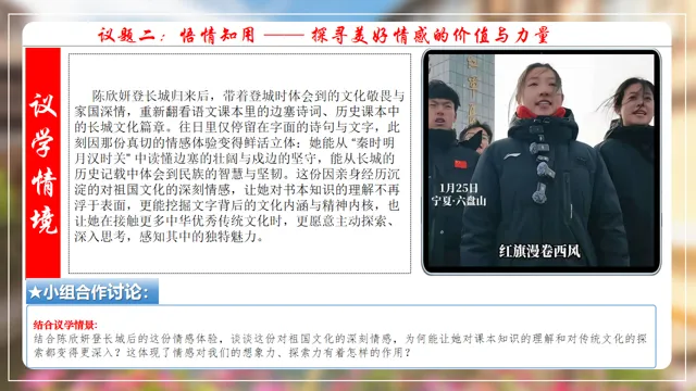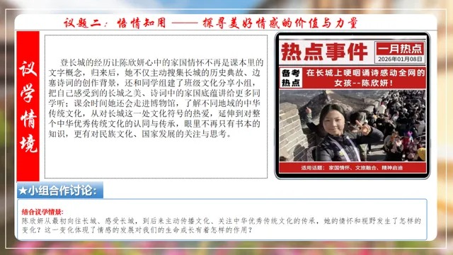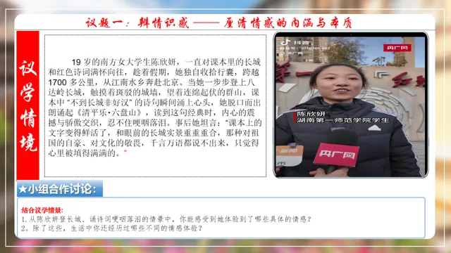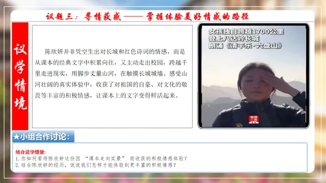 本节课以在长城朗诵诗的女大学生新闻为素材,设置四个议学环节引导学生如何理解品味美好情感。