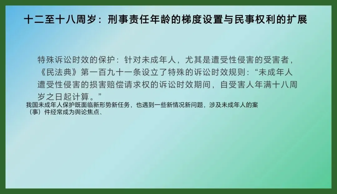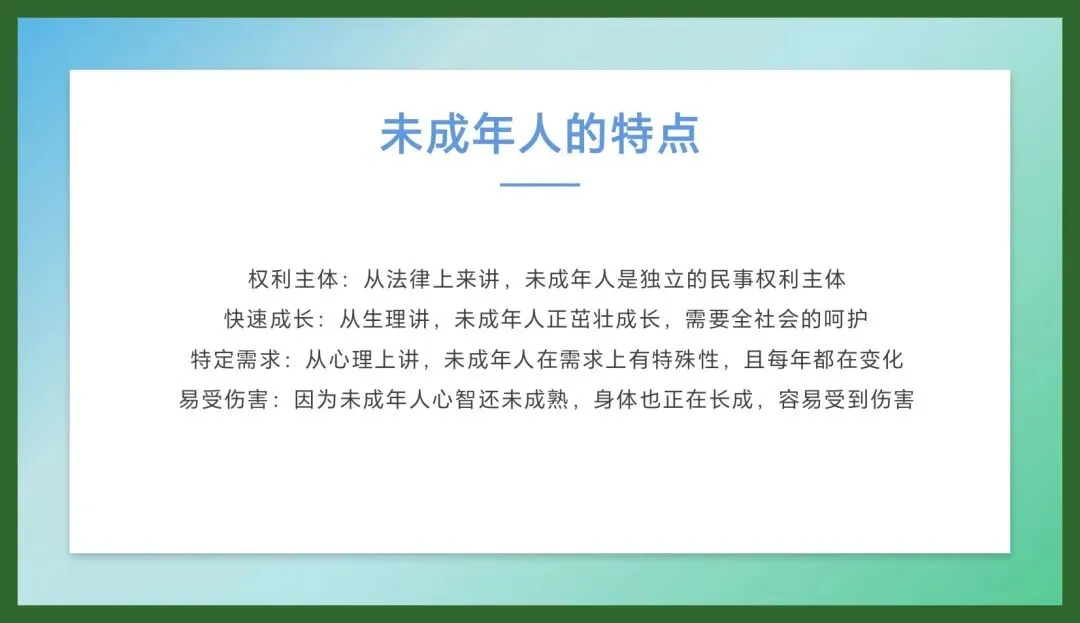 我国未成年人保护事业,正处在一个前所未有的法治新时期。以《中华人民共和国民法典》的颁布施行为标志,辅之以新修订的《未成年人保护法》、《预防未成年人犯罪法》、《家庭教育促进法》以及《刑法修正案(十一)》等法律法规,共同编织了一张日益严密的法律保护网。这张网的核心精神,凝聚于《未成年人保护法》第四条所确立的“最有利于未成年人”原则。该原则要求我们在处理一切涉及未成年人的事务时,必须给予其特殊、优先保护,尊重其人格尊严,并适应其身心发展的规律和特点。这不仅是立法的基本准则,也应成为司法、执法乃至全社会行动的普遍共识。然而,法律体系的完善,并不意味着现实挑战的自动消解。最高人民检察院历年发布的未成年人检察工作白皮书显示,侵害未成年人犯罪案件数量曾一度呈上升趋势,涉及性侵害、暴力伤害、网络侵害等类型的问题依然突出。与此同时,未成年人违法犯罪问题也呈现出低龄化、团伙化、网络化等新特点,如利用未成年人实施电信网络诈骗等新型犯罪不断出现。这些现象警示我们,保护与预防的双重任务依然艰巨。人民群众的期待,已从权益保障“有没有”的基础层面,提升到“好不好”乃至“更加好”的质量层面。这要求我们的法律保护必须更加精准、更加有力、更加体现温度。未成年保护绝非单一环节的孤立行动,而是一项环环相扣、错综复杂的系统工程。这需要全社会凝聚共识、携手共进,更需要各级政府部门、家庭、学校以及人民法院等各方主体各司其职、协同发力。二 未成年人保护现状在深入法律条文之前,我们必须清醒地认识到法律所意图规范的现实。未成年人保护工作,本质上是对一个动态成长、脆弱又充满潜力的群体进行风险干预和权利保障。当前,我们主要面临以下几对突出的矛盾:未成年人的特点权利主体:从法律上来讲,未成年人是独立的民事权利主体在法律的框架内,未成年人被赋予了独立的民事权利主体地位。这意味着他们拥有自己的合法权益,可以依法享有和行使权利,同时也需承担相应的义务。例如,未成年人可以拥有个人财产,签订合同,以及在法律允许的范围内进行民事活动。尽管他们可能需要父母或法定监护人的同意或指导来执行某些法律行为,但他们的权利是受到法律保护的。例如,未成年人的继承权、受教育权和隐私权等,都是法律明确规定的,任何侵犯这些权利的行为都将受到法律的制裁。