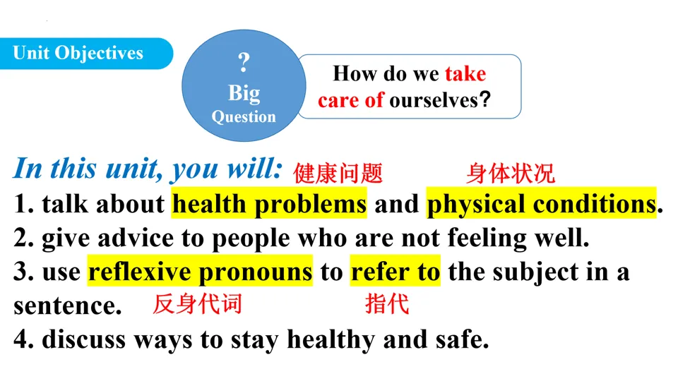 - 抛出单元大问题:How do we take care of ourselves?,引发学生思考,明确本节课学习方向。