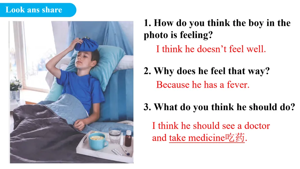 - 展示单元开篇“卧床生病男孩”的图片,围绕 Look and share 问题展开互动: