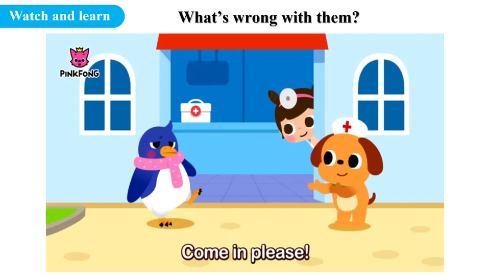 - 播放小动物生病的短视频或展示图片,提问:What's wrong with them?