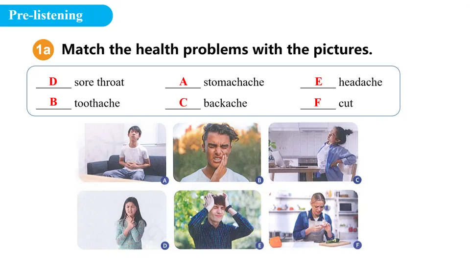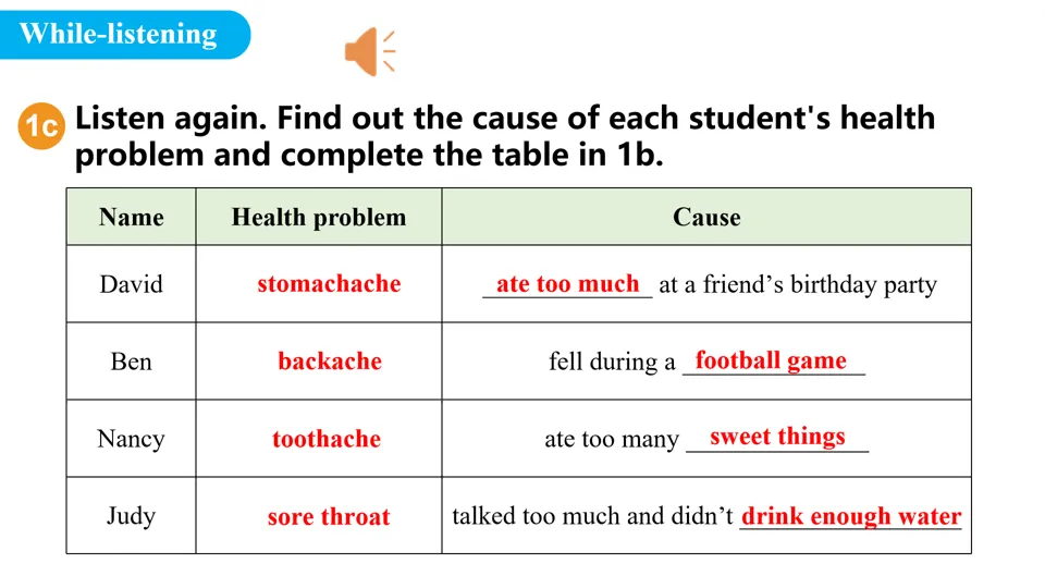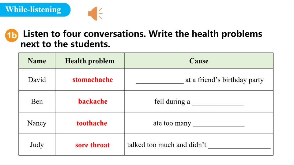 - 播放听力录音,要求学生完成表格:将学生姓名与对应的健康问题进行匹配。