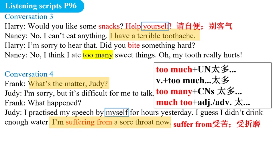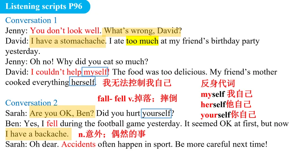 3. 高频短语:如 have a stomachache , fall down , talk too much 等。