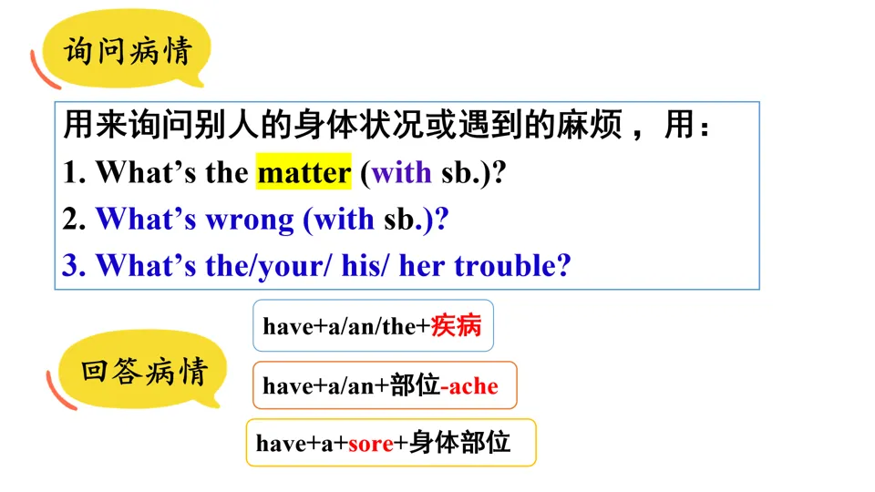 - 🔹 回答:I have a/an + 病症 (e.g. I have a stomachache.)