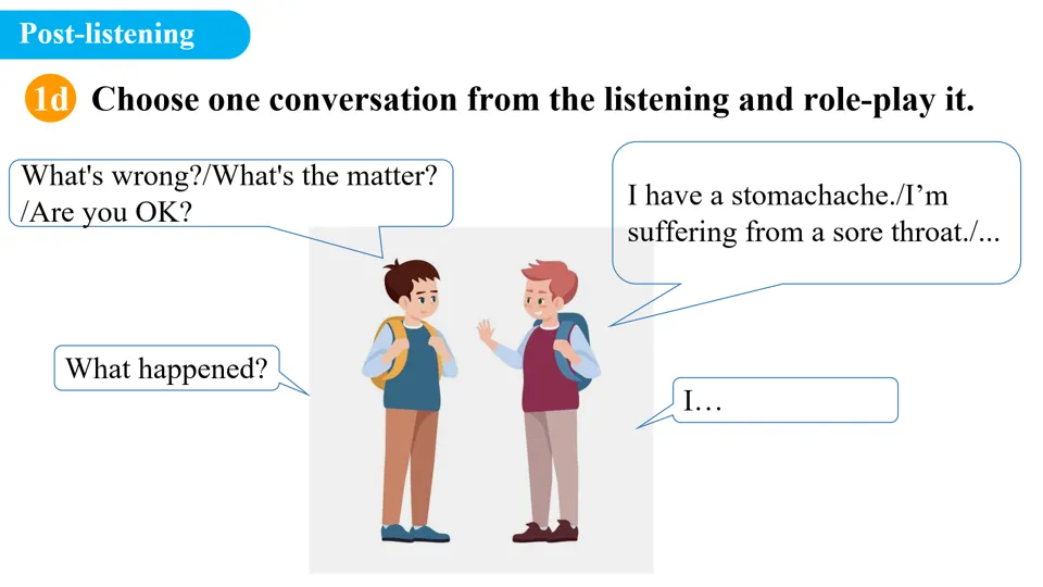 - 自然过渡到本节课核心问题:What should we do when we don't feel well?