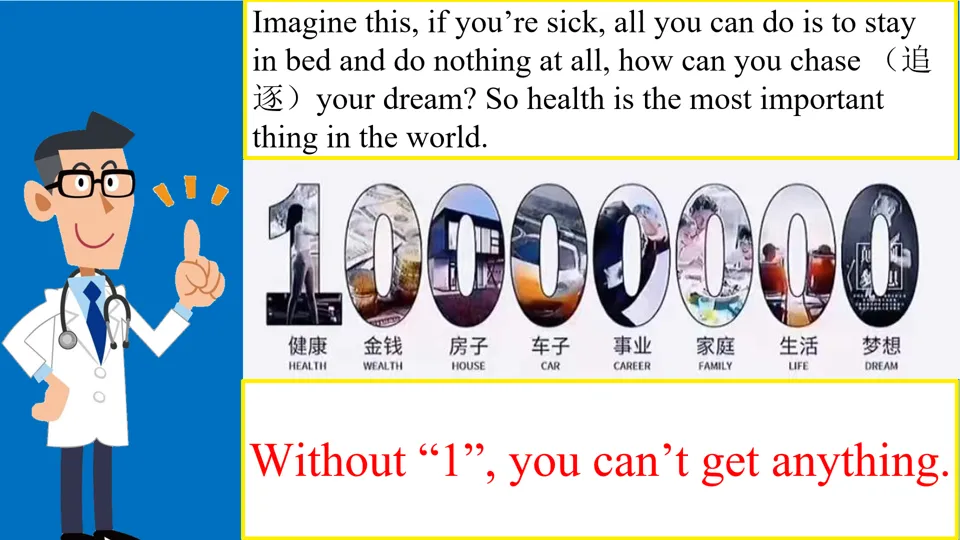 - 总结:Health is the most important thing in the world. Without it, you can't get anything. 培养学生重视健康的意识。