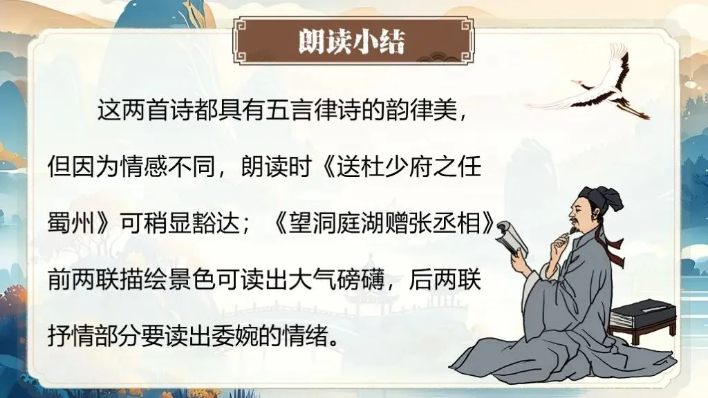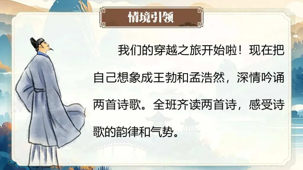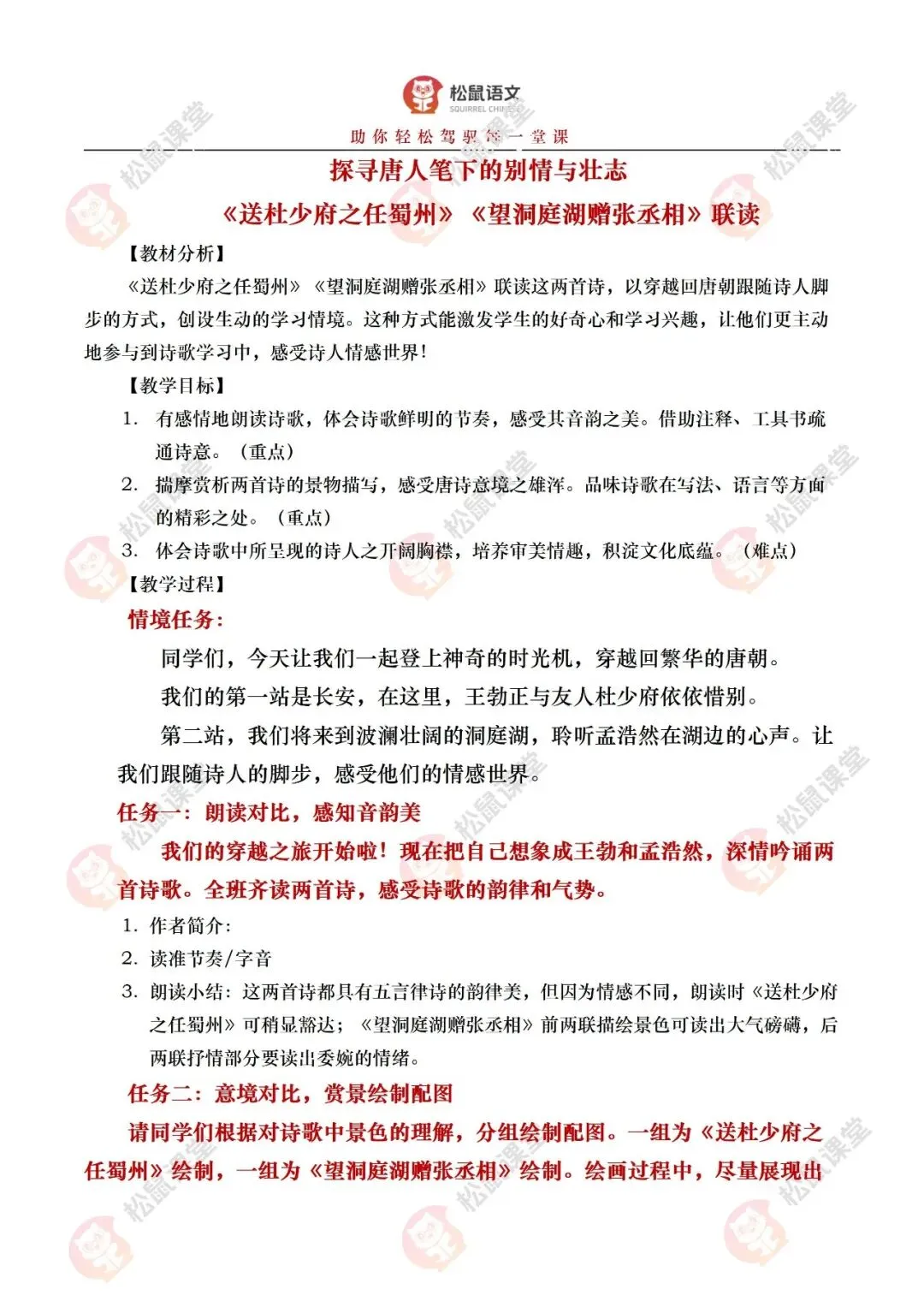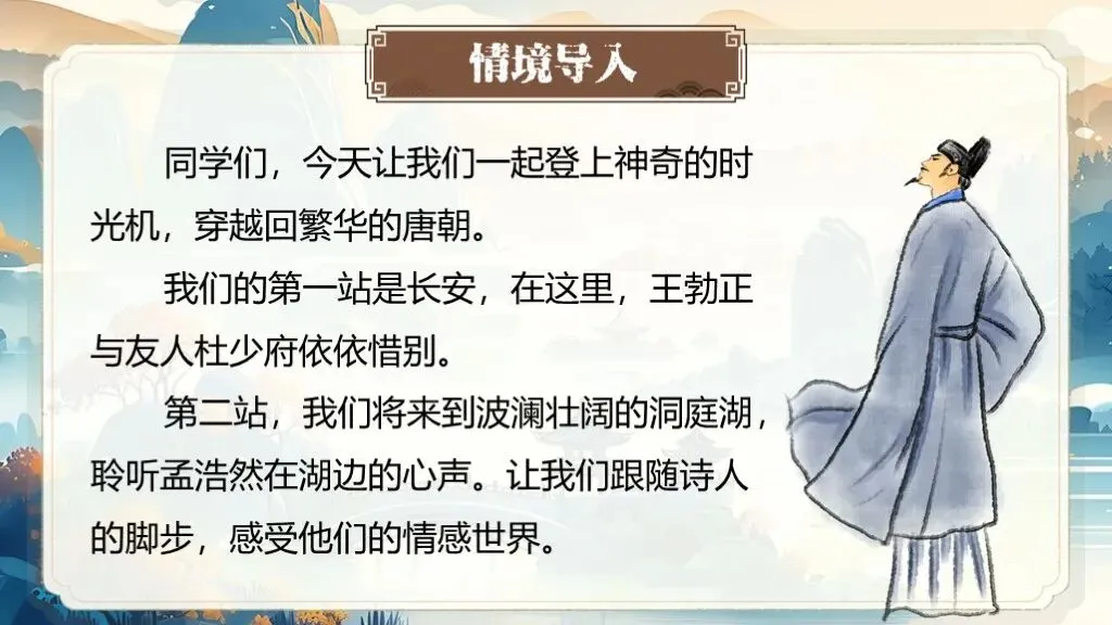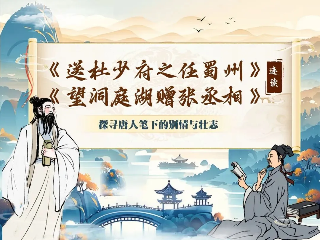 《送杜少府之任蜀州》《望洞庭湖赠张丞相》联读这两首诗,以穿越回唐朝跟随诗人脚步的方式,创设生动的学习情境。这种方式能激发学生的好奇心和学习兴趣,让他们更主动地参与到诗歌学习中,感受诗人情感世界!
