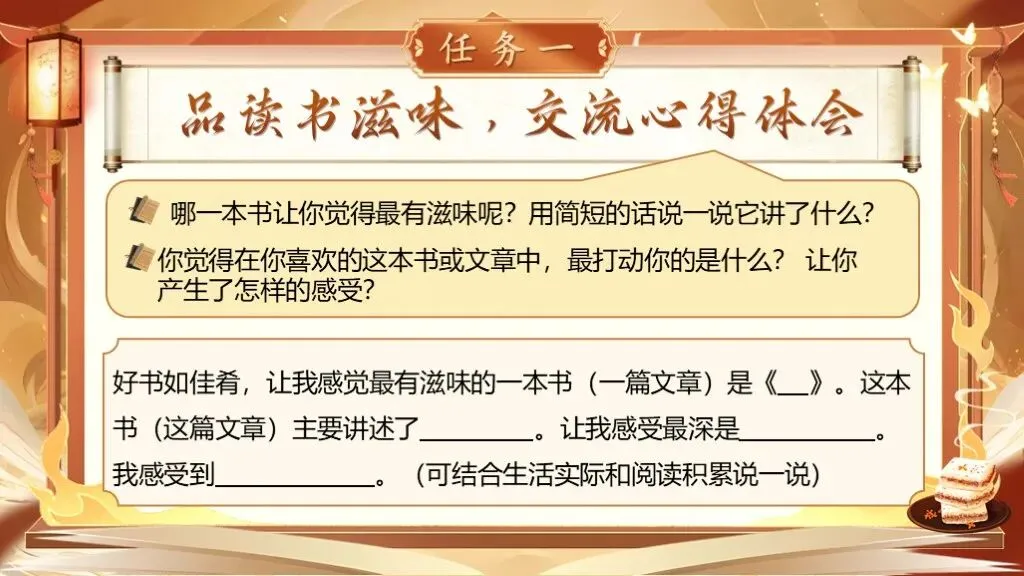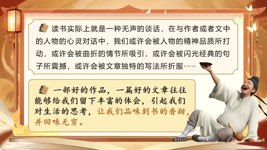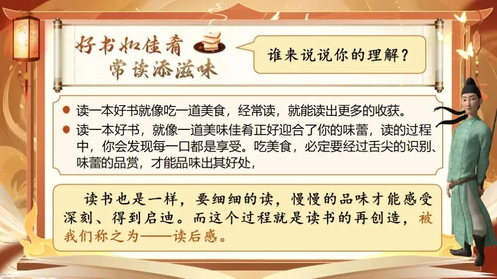 预设:读一本好书就像吃一道美食,经常读,就能读出更多的收获。