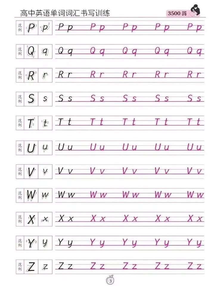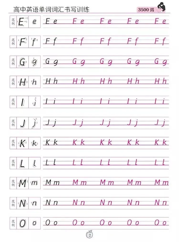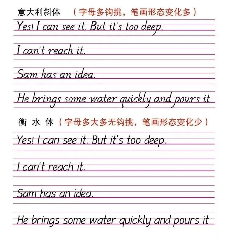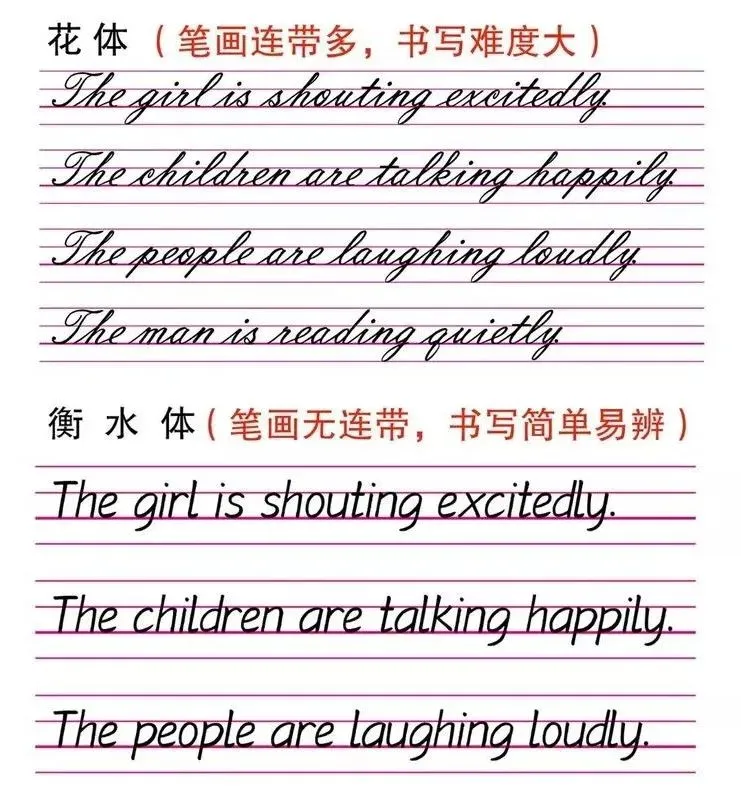 2、清晰而简捷的笔画,无勾挑,不连带,是写好中高考试卷的首选3、与英文手写印刷体比较:t增加了附钩,l增加一小钩以免于与大写的I混淆,y变直线为弧线。4、与意大利斜体比较:没过多缠绕笔法,使笔画显得更简单。5、与花体比较:衡水体字字独立,无连带运笔,避免了笔画的混化,便于电脑识别,难怪广受学生喜爱。这些特点,使得“衡水体”英文作文试卷在扫描到电脑之后,比其他字体更加清晰。直尺,铅笔,橡皮,0.9mm中性碳素笔,任意横格纸或考试答题卡第一步:拿出准备好的直尺,在横线上4或5mm处使用铅笔画出一条直线,然后重复操作至最后一行。第二步:拿出准备好的0.9mm中性笔,首行空两格开始认真书写。2、字母与字母之间的间距要求清楚,单词与单词之间的间距要一个字母的间距。3、字母要求顶格写满。比如a,c,e,m,n,o这些一个格书写的字母,必须写满横格,b,d要求不写过底线,p,q要求不能写过上线。f的那一横必须出现在手画线上或者是附近。4、书写过程要求不能写出花体或者连笔,全部书写完以后等待大概30秒,让油墨自然风干,最后取出橡皮擦,从上到下依次擦掉手画线。当然,衡水体英语书写一开始也离不开老师的指导,老师们会在日常练习中一个字母一个字母的修改纠正。一个字母写不好都要更正,“一笔也不要多,一笔也不要少”,也难怪能教出这样的学生了!1.字母字形,每一个字母有它自己形状,不可多一笔也不可少一笔,是什么样就写什么样。2.字母笔顺,字母和汉字一样有笔画的先后顺序,按顺序书写可规避笔画交错异常情况。3.字母格位,即字母在一线格上的位置,字母不可连接上线,要留白,字母底部落在一线格上,字母顶部与上行线距离约占一线格间的3/5。4.字母宽度,规范的字母宽度为大写5毫米,小写3毫米。5.字母高度与宽度对应,太高会超过上行线或一线格,太低会使字母字形变样。6.字母斜度,即字母与一线格的夹角,规范书写下的字母与线之间的夹角为75-85度。8. 字母间距,即单词中字母与字母间的距离,规范间距约在1毫米内。10.句子行距,即上行句子与下行句子之间的距离,在一线格上书写时,行距均等,主要需注意上下行中偏长字母如f,切勿有长笔交错现象。书写时,笔触有劲,书写速度一定要慢,这也是要求心态的重要一点。没有一蹴而就的成绩,衡水体英文书写练习,先要一个字母一个字母的进行练习,字母练习时,集中注意力,牢记英文书写的10要素,重点注意每一个字母的字形和笔顺,按照每一个字母书写教程来练习。单词是由字母一个一个组合而成,句子是由单词组合,所以先练好单个的字母,衡水体英文书写也就成功了一半了!最后给大家整理了文章展示的这套课件及配套视频课程,赶紧替孩子收藏吧!