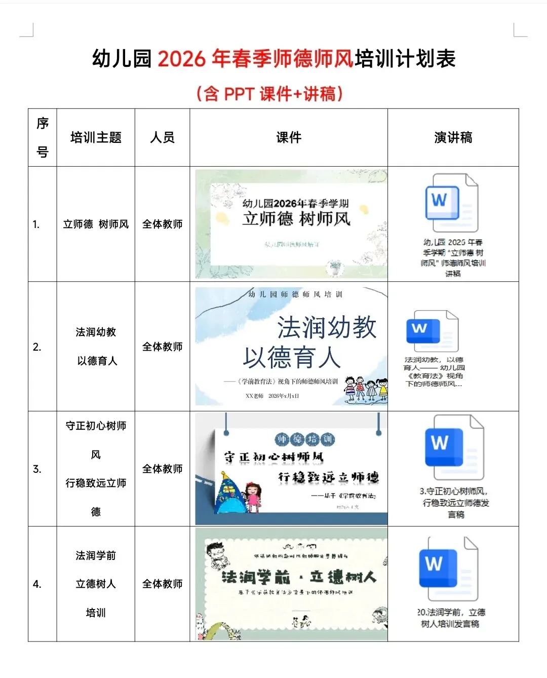 幼儿园春季学期师德师风培训计划表、课件、配套讲稿20周