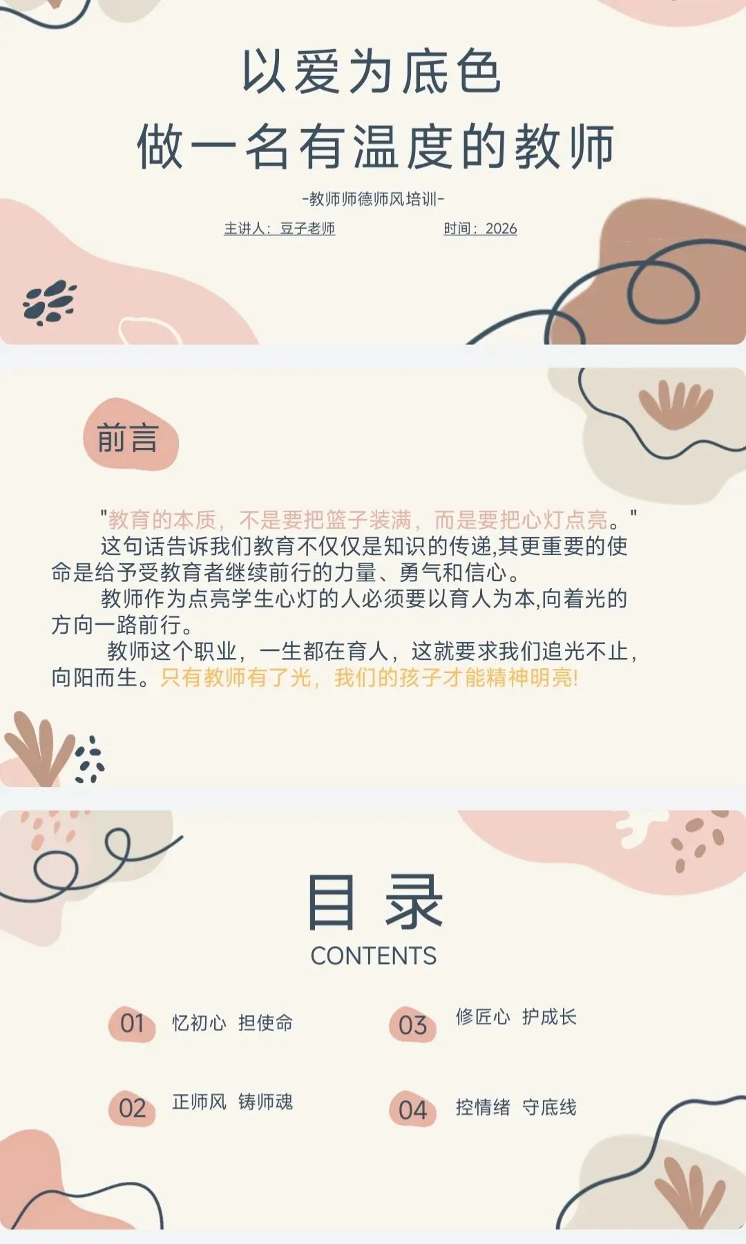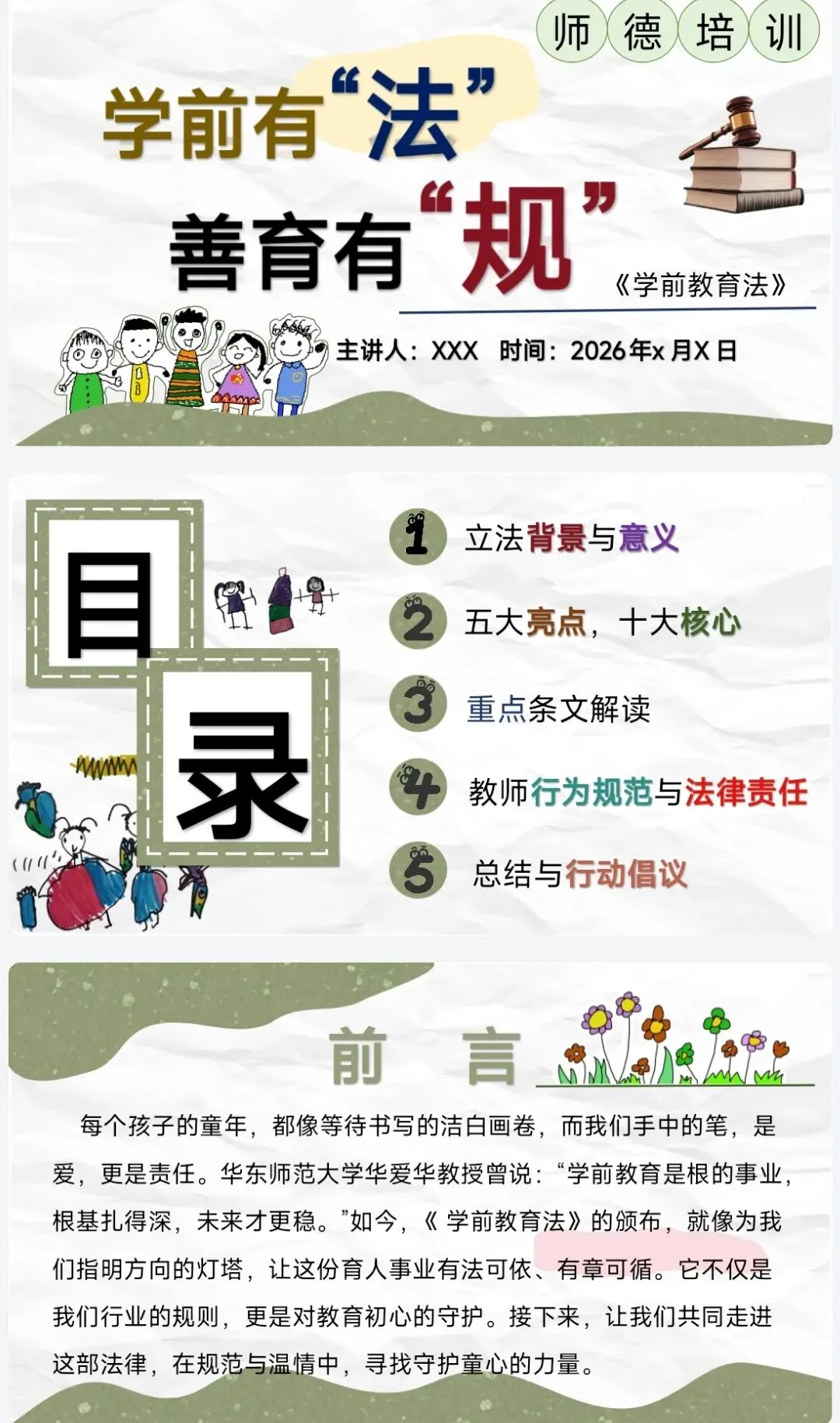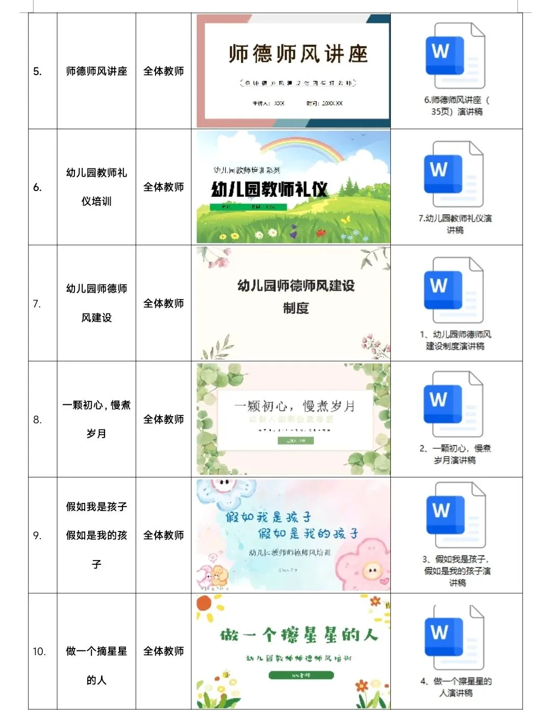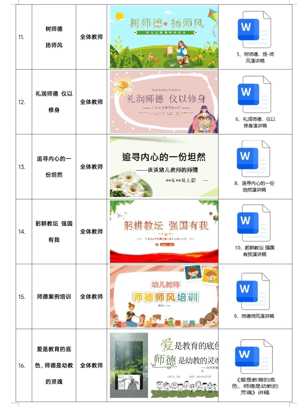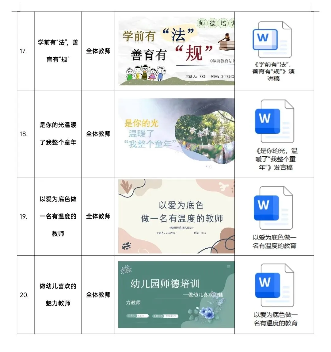 >幼儿园春季学期师德师风培训计划表、课件、配套讲稿20周
