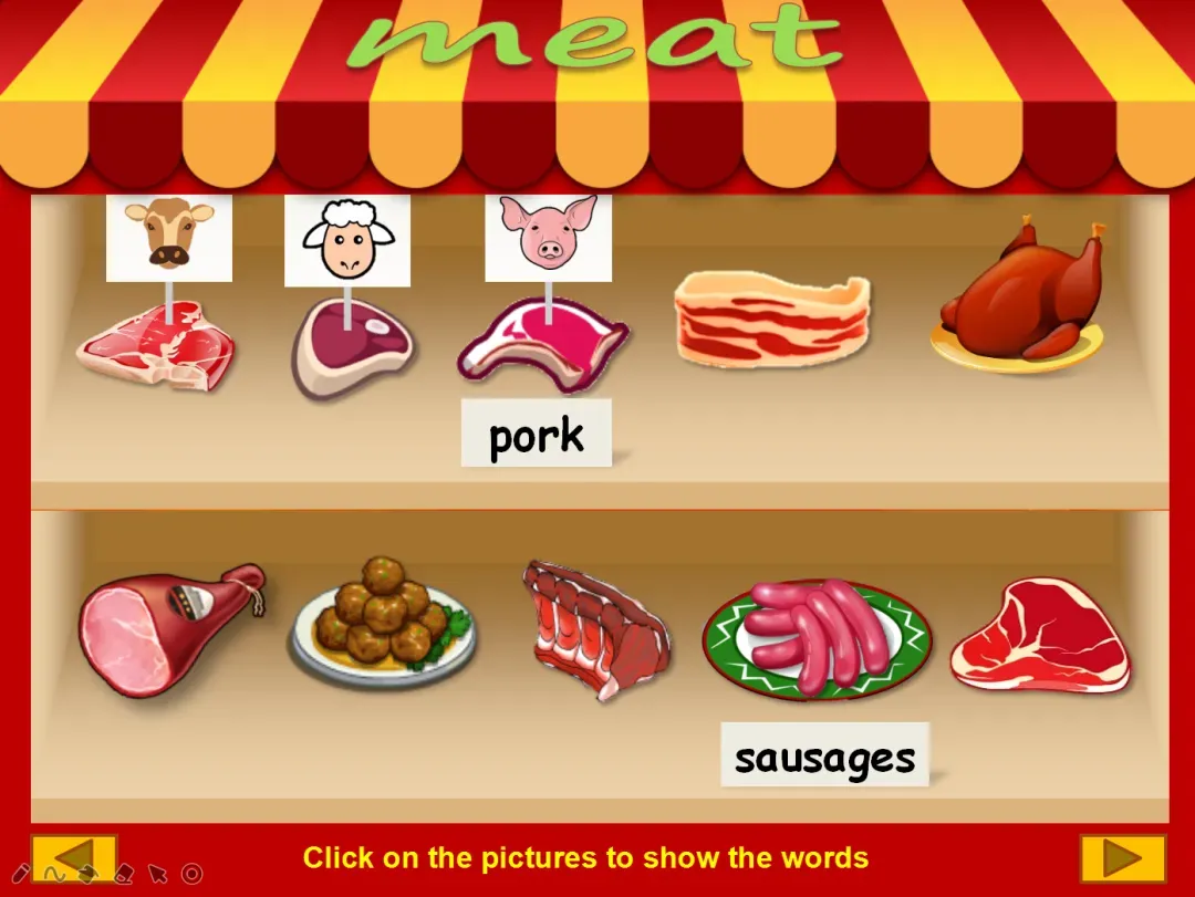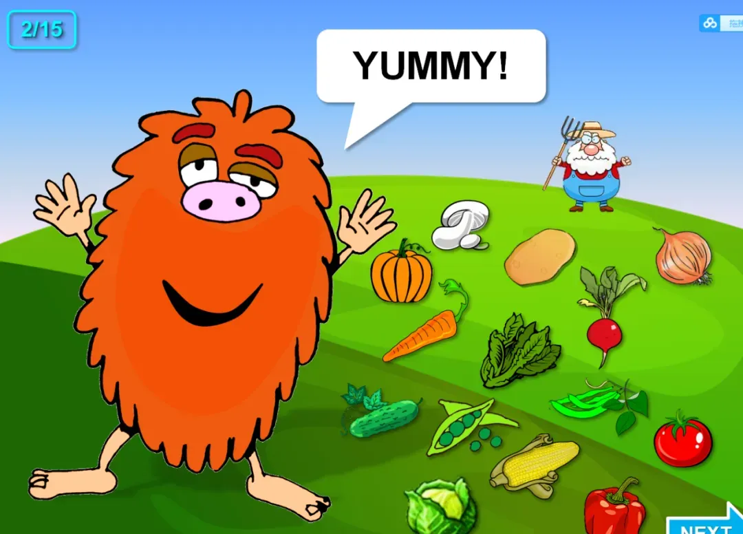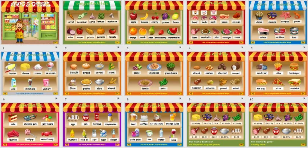 其中主题包括:食物、动物、情绪、家庭、服装、颜色、数字和天气 ,每一个PPT都很有设计感,交互性很强,轻松点燃课堂气氛,激发孩子们学习兴趣~这是一个依托于超市的场景,在货架上满满排布着水果、蔬菜、肉蛋奶等等,他们的英文名都是什么呢?点击就会出现哦!巧妙的吃豆豆游戏,左边出现要求,然后用鼠标去点击相应的物体,才能让吃豆豆的小人顺利地吃到哦!成功吃到的食物会出现在左边的“功勋墙”上,成就感满满哦!怎么下载