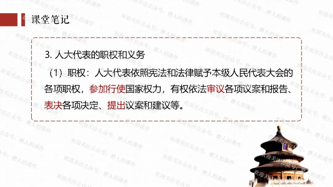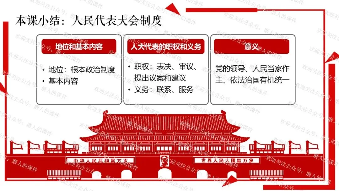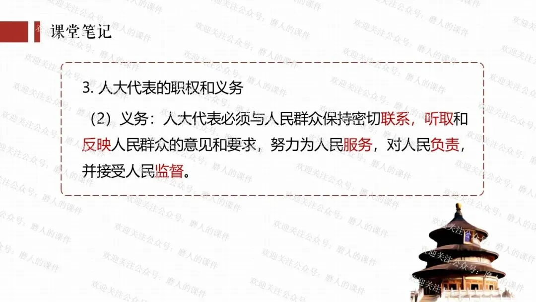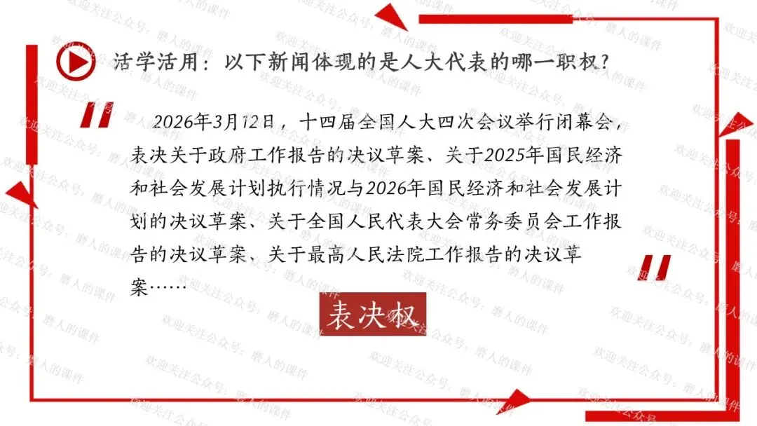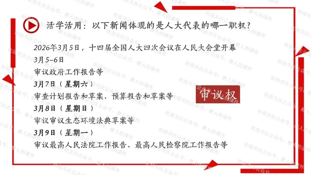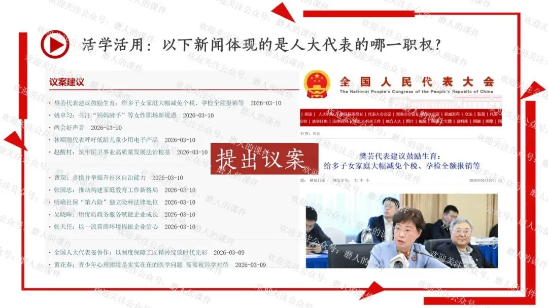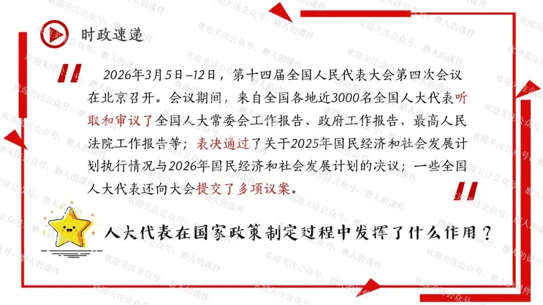 我以2026年全国“两会”新闻贯穿全课。通过全国人大会议日程安排等学习人大代表的职权;通过代表履职故事学习人大代表的义务,再辅以探究性问题,介绍“82岁老人写在烟盒上的建议获采纳”的故事、2026年全国人大代表部分提案、习总书记的两会约定,感受人民代表大会制度的优越性,坚定制度自信。最后呈现本课的知识框架。课件逻辑清晰,素材丰富,兼具知识讲授和价值引导。