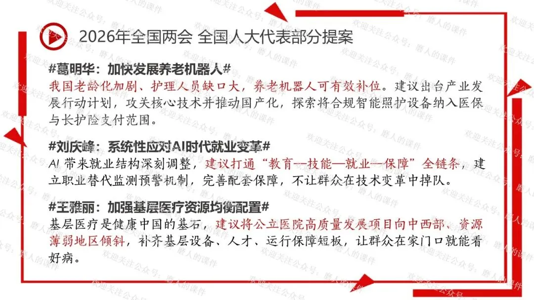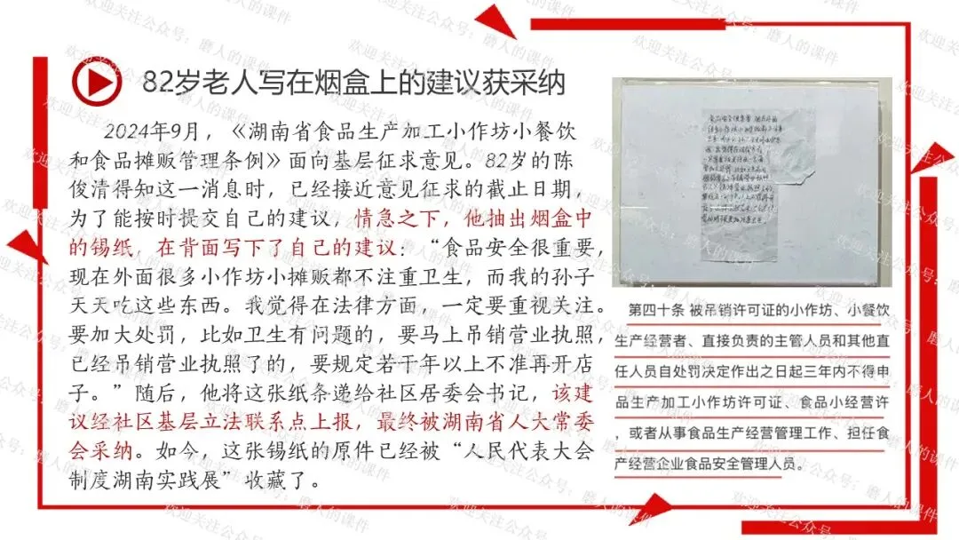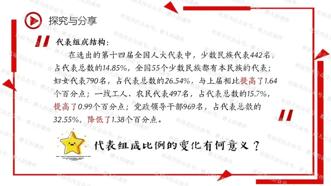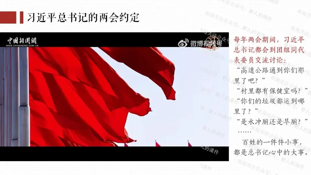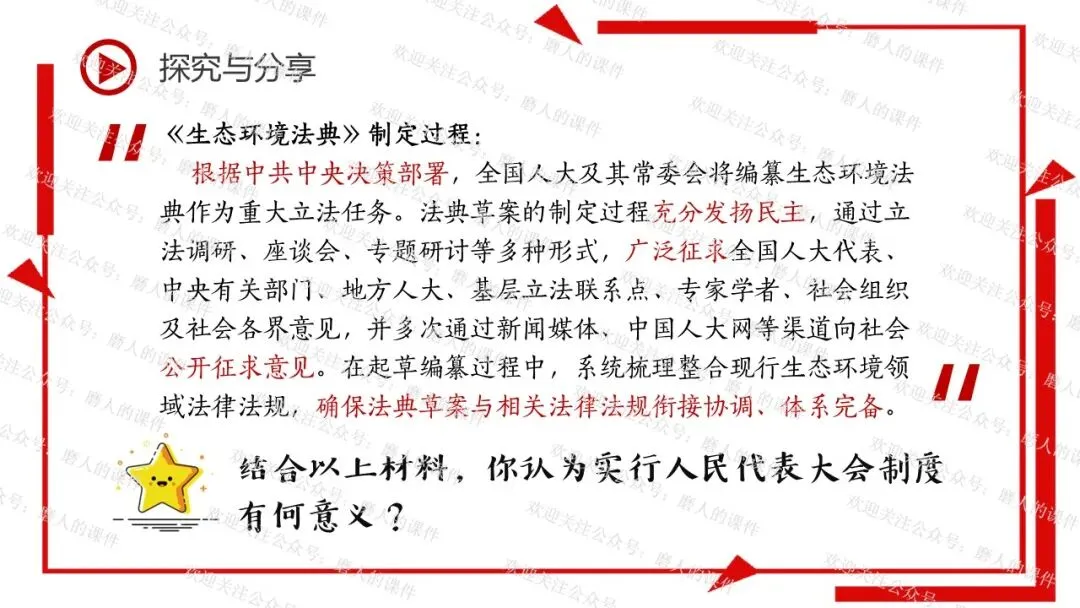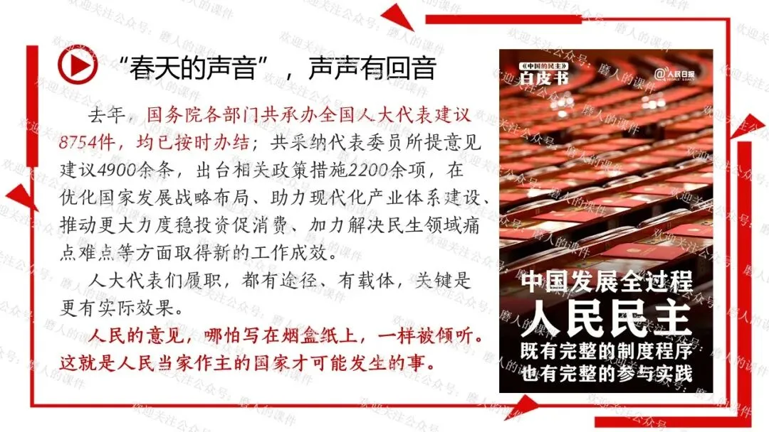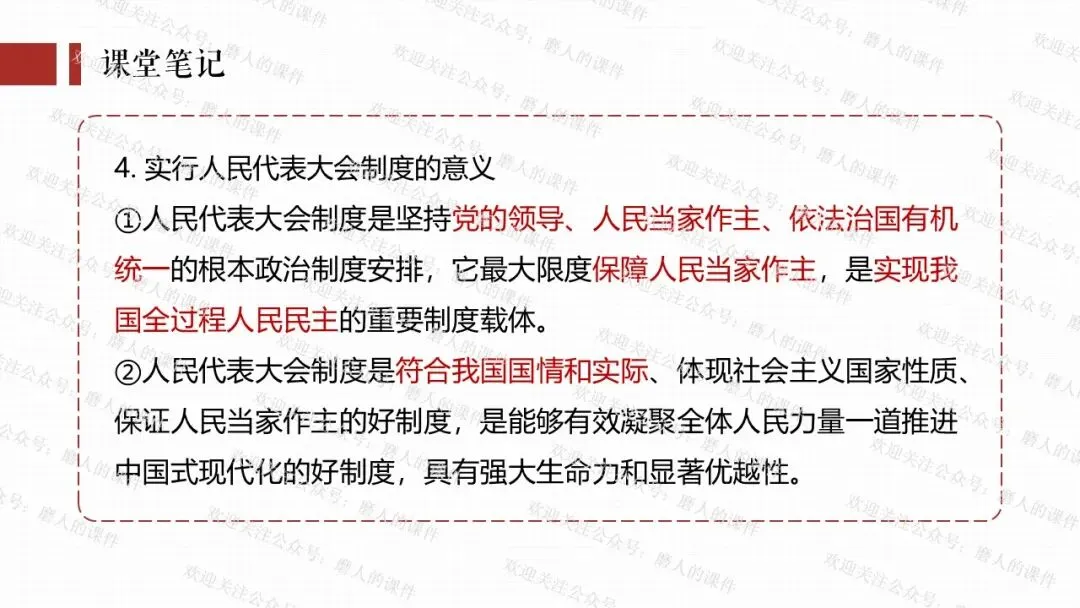 我以2026年全国“两会”新闻贯穿全课。通过全国人大会议日程安排等学习人大代表的职权;通过代表履职故事学习人大代表的义务,再辅以探究性问题,介绍“82岁老人写在烟盒上的建议获采纳”的故事、2026年全国人大代表部分提案、习总书记的两会约定,感受人民代表大会制度的优越性,坚定制度自信。最后呈现本课的知识框架。课件逻辑清晰,素材丰富,兼具知识讲授和价值引导。