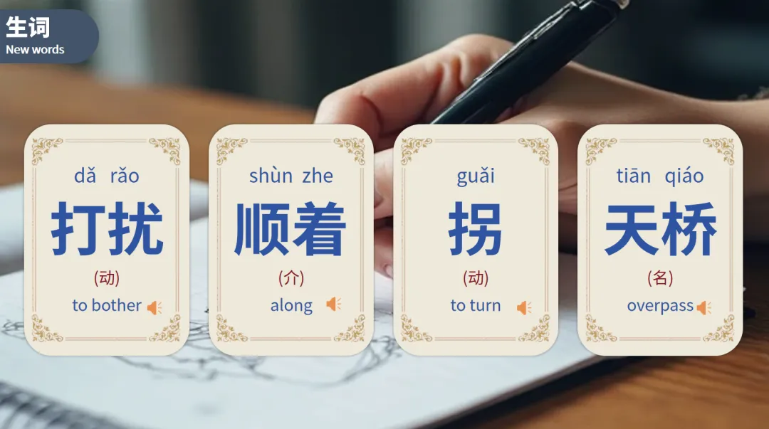 在进入正式对话之前,课件先带领学生们学习了相关的生词,如“打扰”、“顺着”、“拐”、“天桥”等。