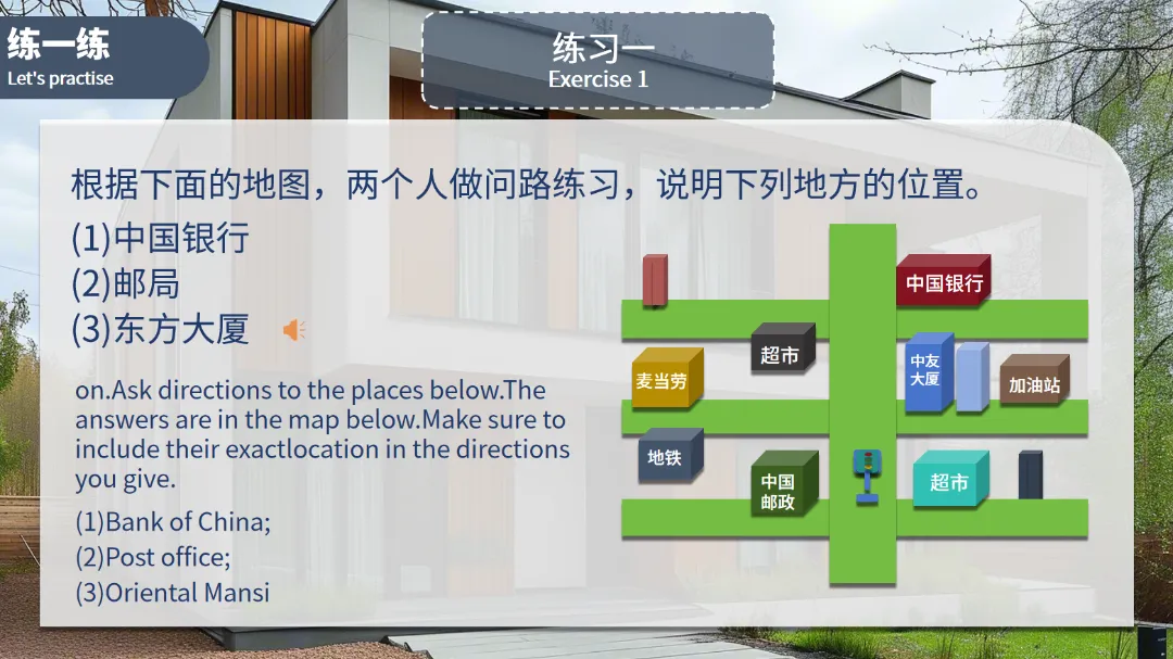 在练习一中,学生们需要根据给定的地图,向同伴询问中国银行、邮局、东方大厦等地方的位置,并清晰、准确地给出回答。