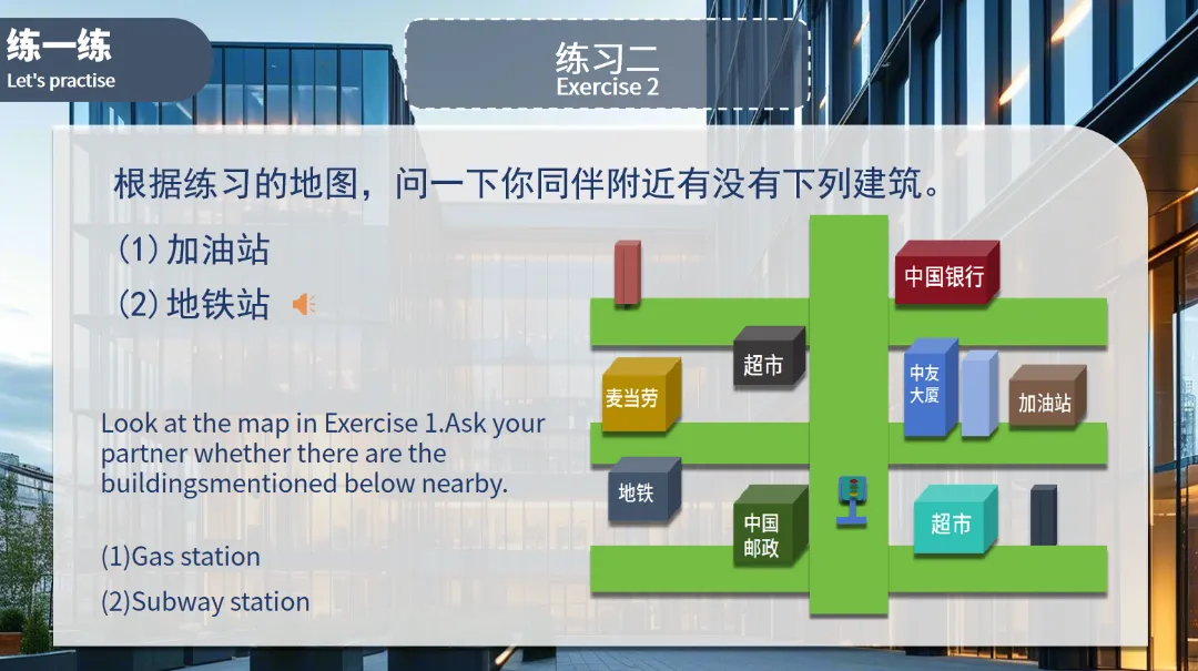 练习二则要求学生根据地图,询问同伴附近是否有加油站、地铁站等建筑。