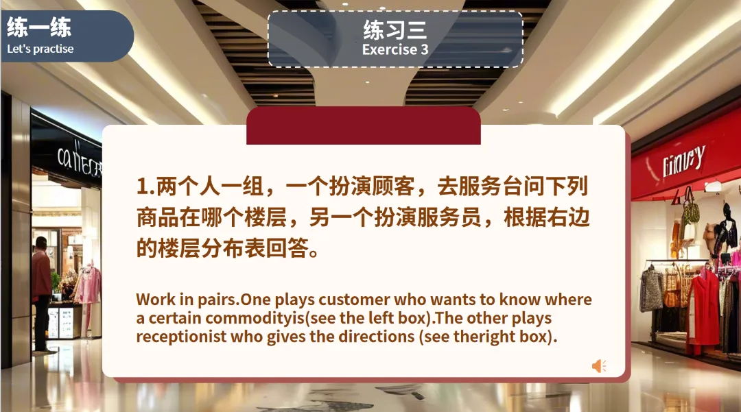 在这一环节中,学生们需要两人一组,分别扮演顾客和服务员,根据楼层分布表回答顾客的询问。