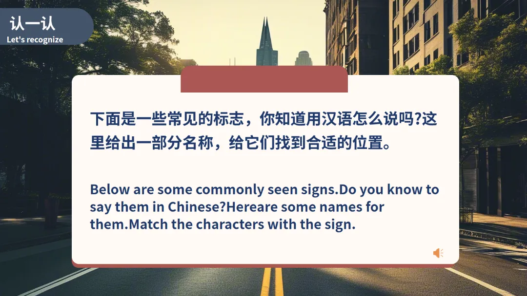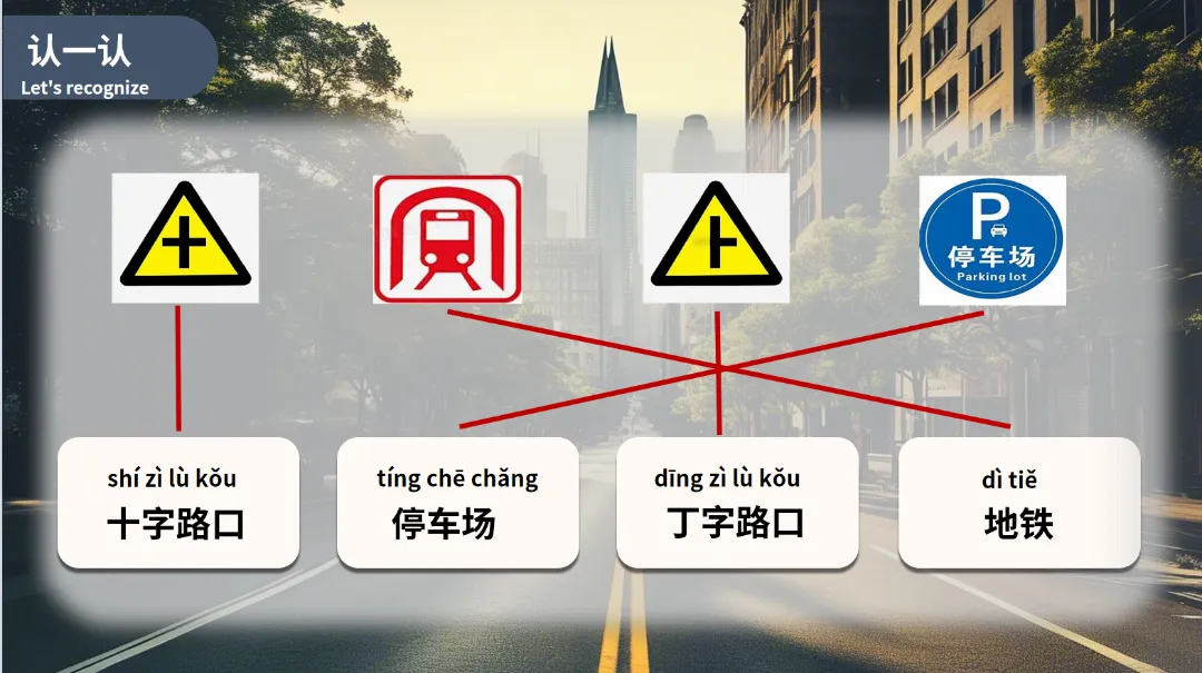 通过展示一些常见的中国交通标志,并让学生们用汉语说出它们的名称,这一环节不仅增加了学生们对中国文化的了解,也让他们在未来的出行中更加得心应手。