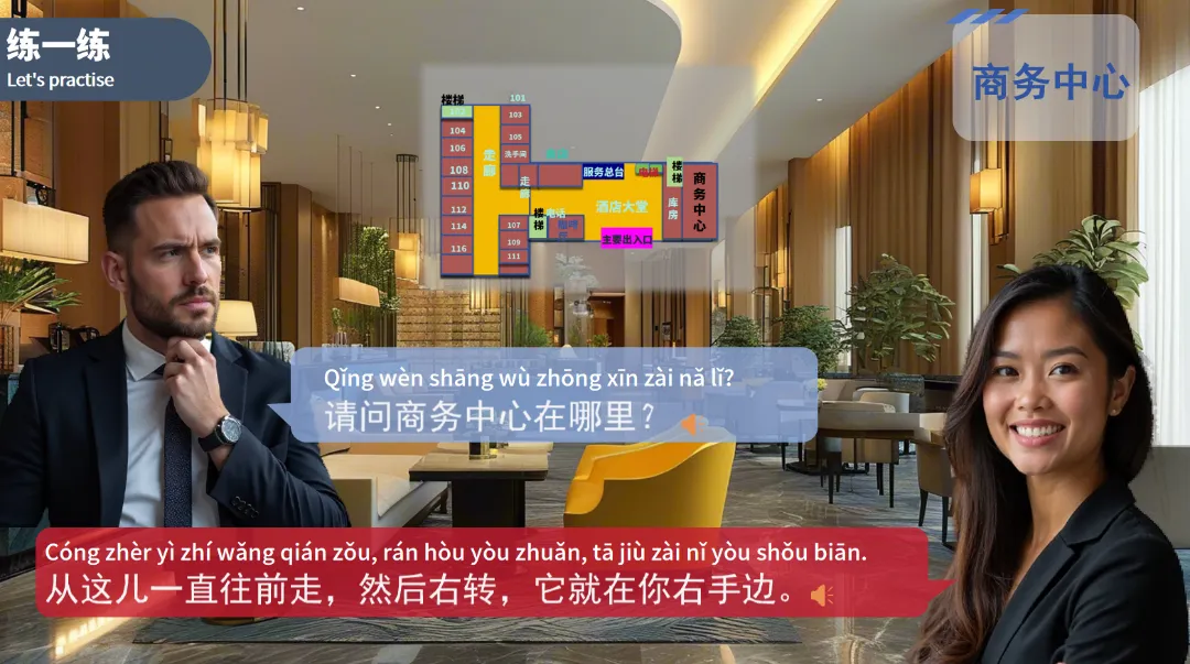 课件还模拟了一个商务中心的场景,让学生们再次进行问路练习。